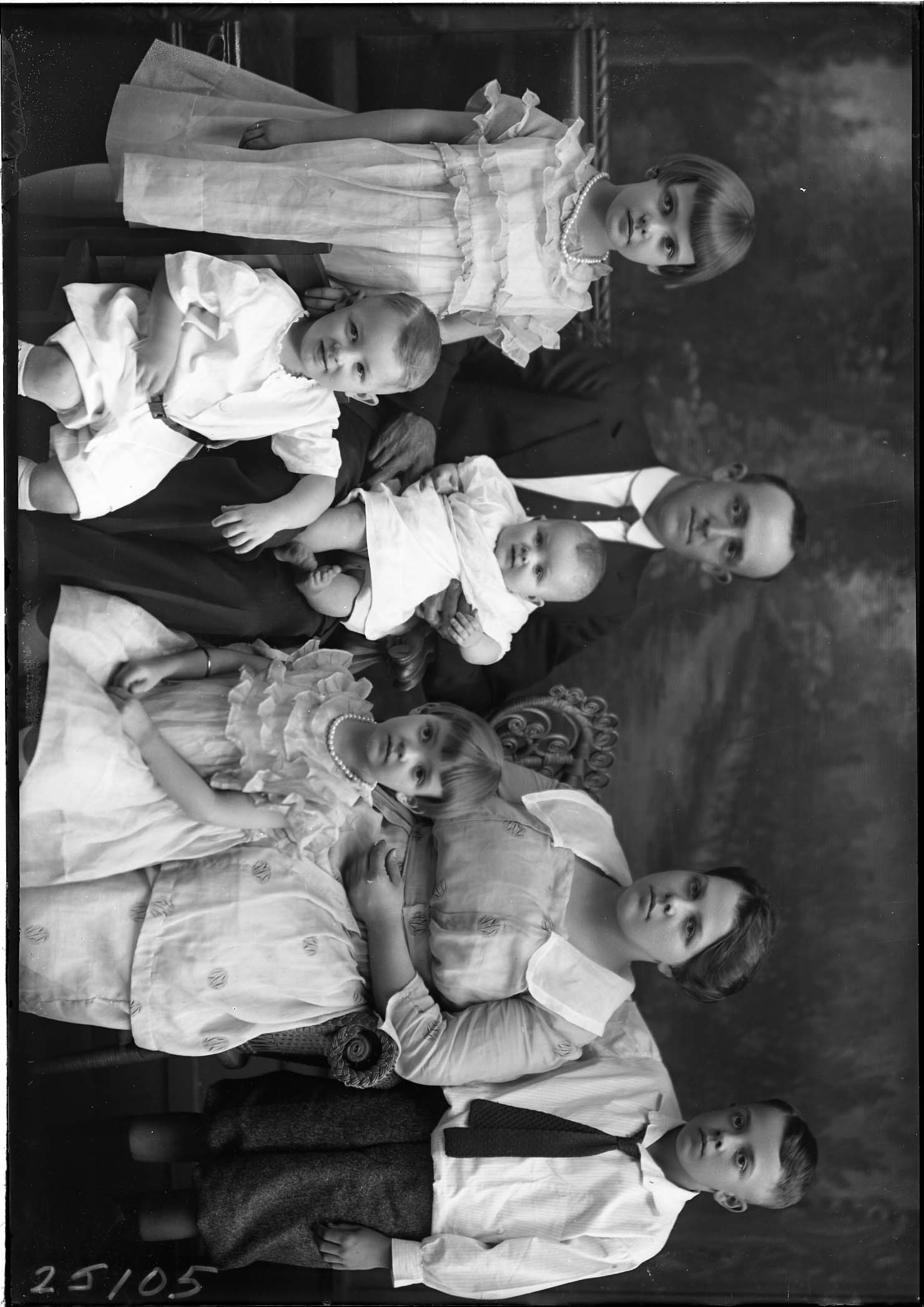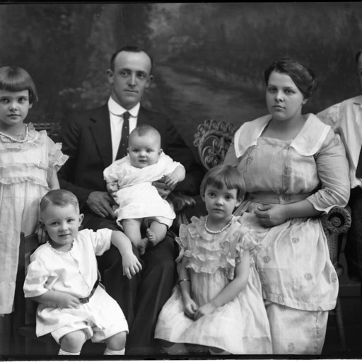 Unidentified man and woman are seated with five unidentified children of varying ages posed around them. There is a baby on the man's lap and two of the girls are wearing matching outfits.