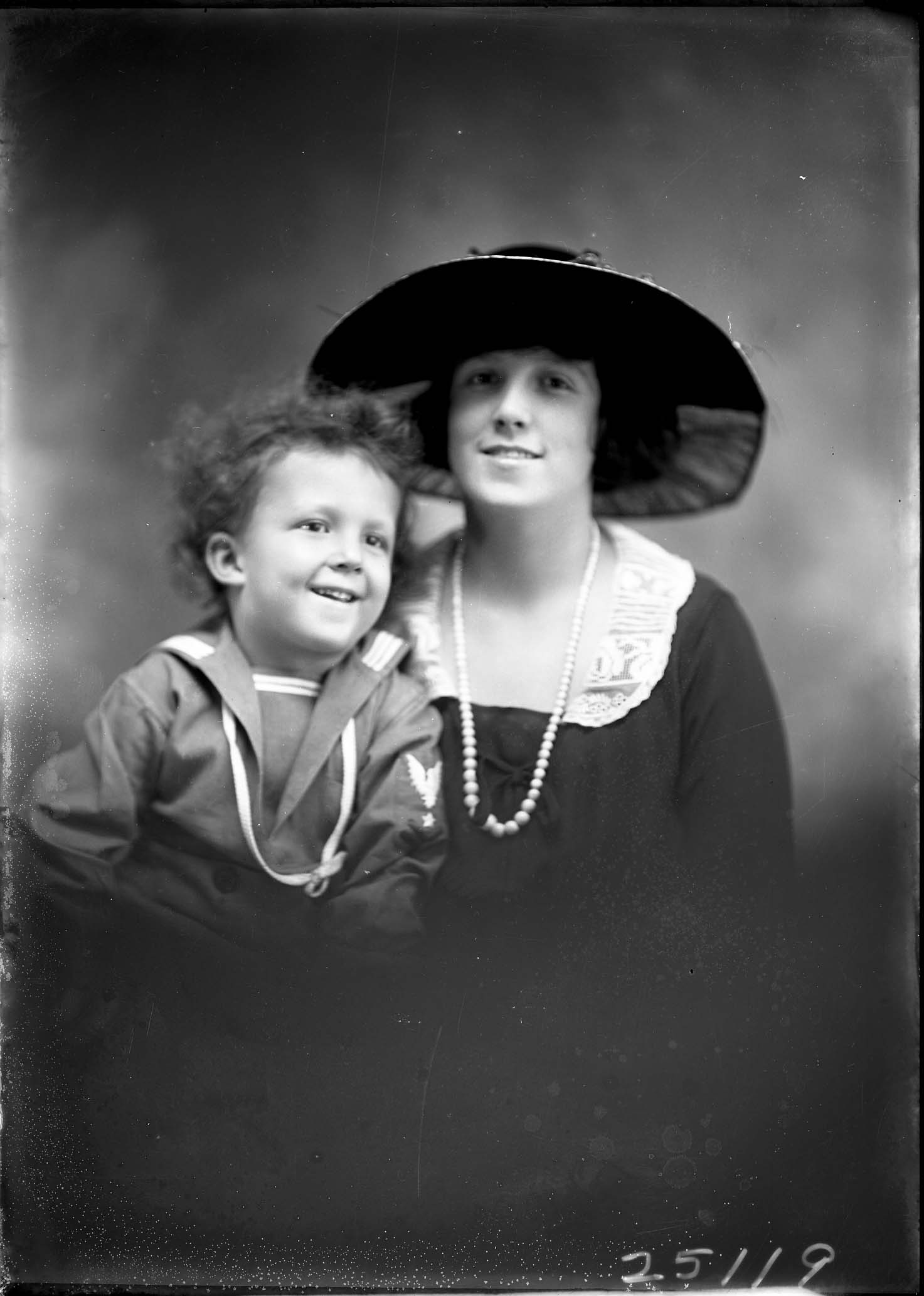 Portrait photograph of an unidentified woman in a wide-brimmed hat posed with an unidentified young boy with curly hair.