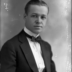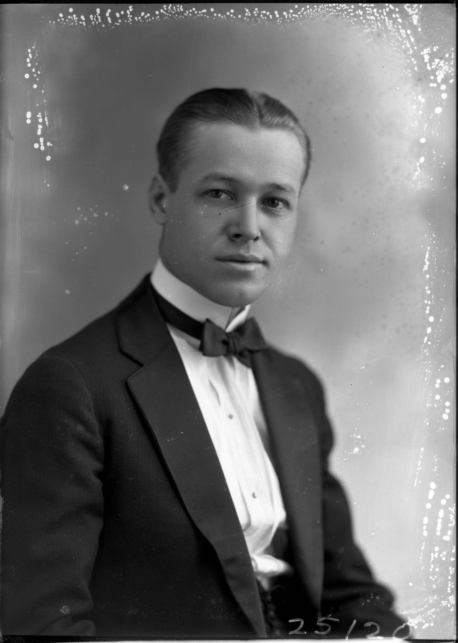Portrait photograph of an unidentified young man wearing a formal suit with a bow tie and starched collar.