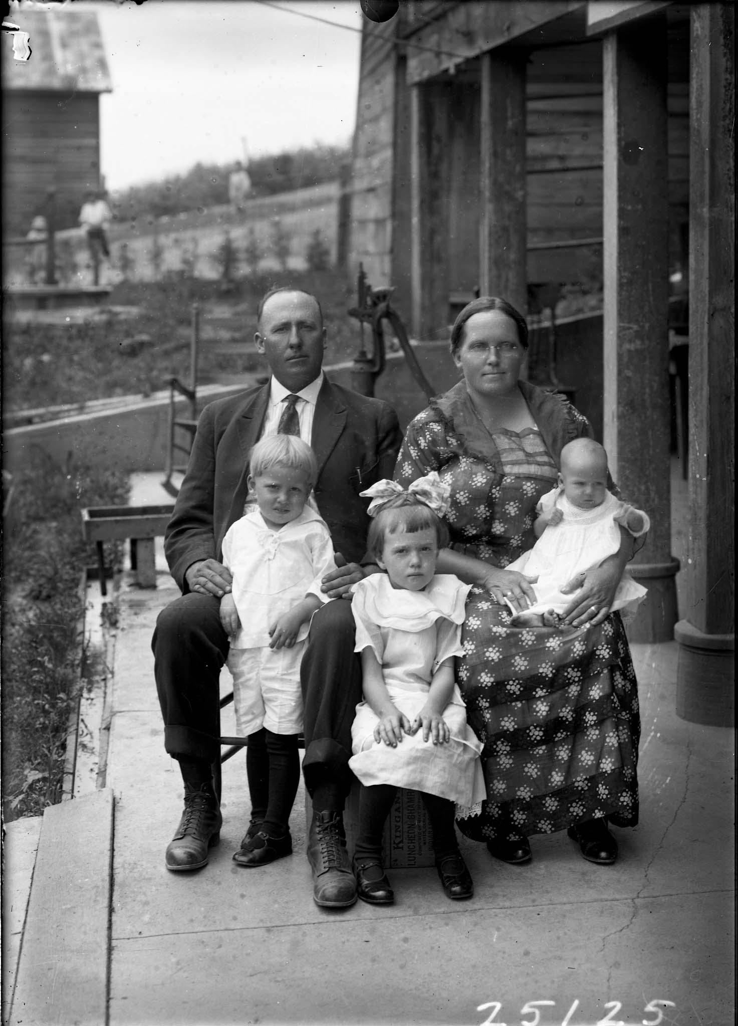 Unidentified man and woman are seated outdoors with three young children posed with them including a baby on the woman's lap.