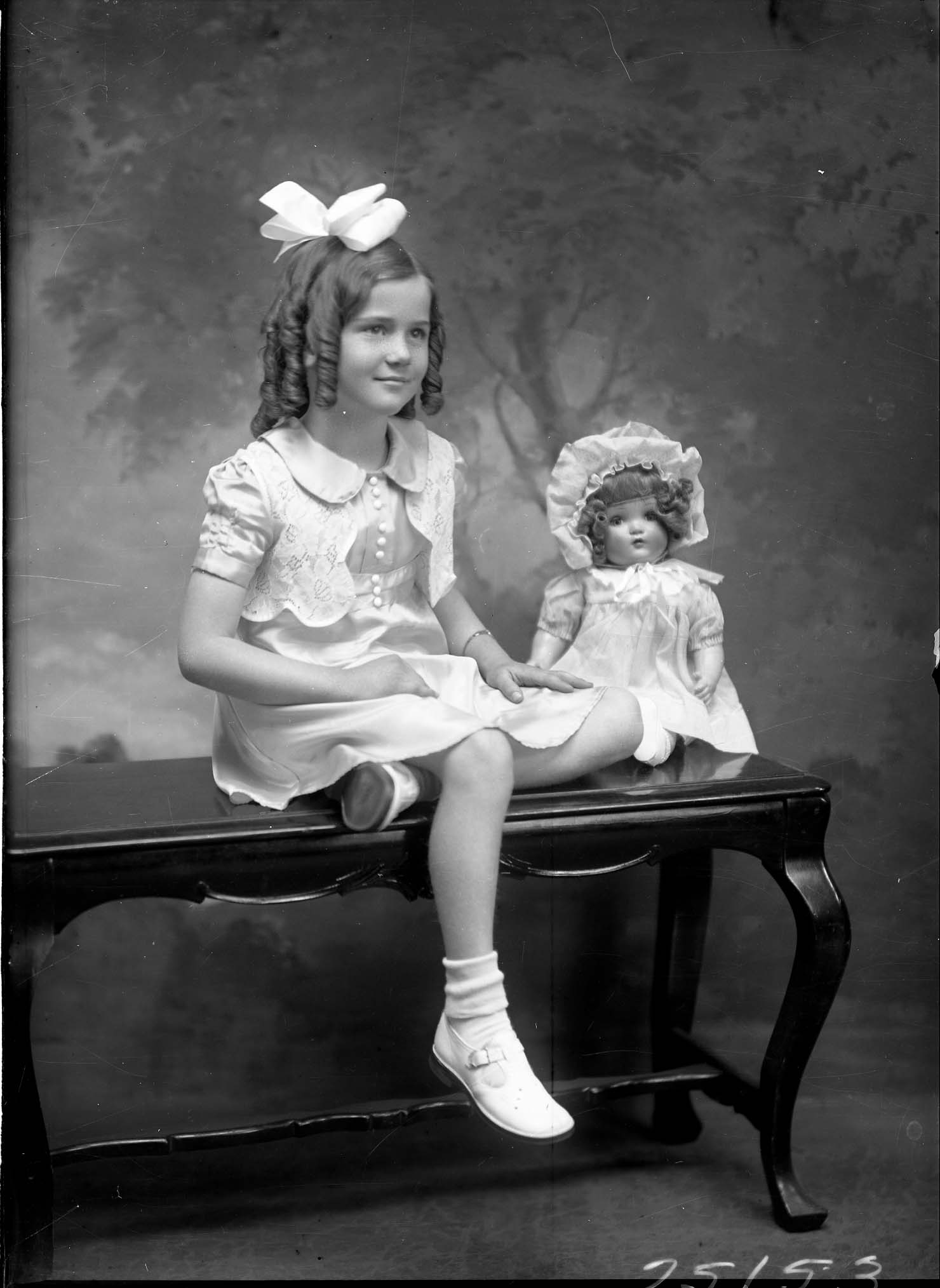 Unidentified girl with a bow in her curled hair is seated on a bench beside a doll. She has one leg tucked under the other.