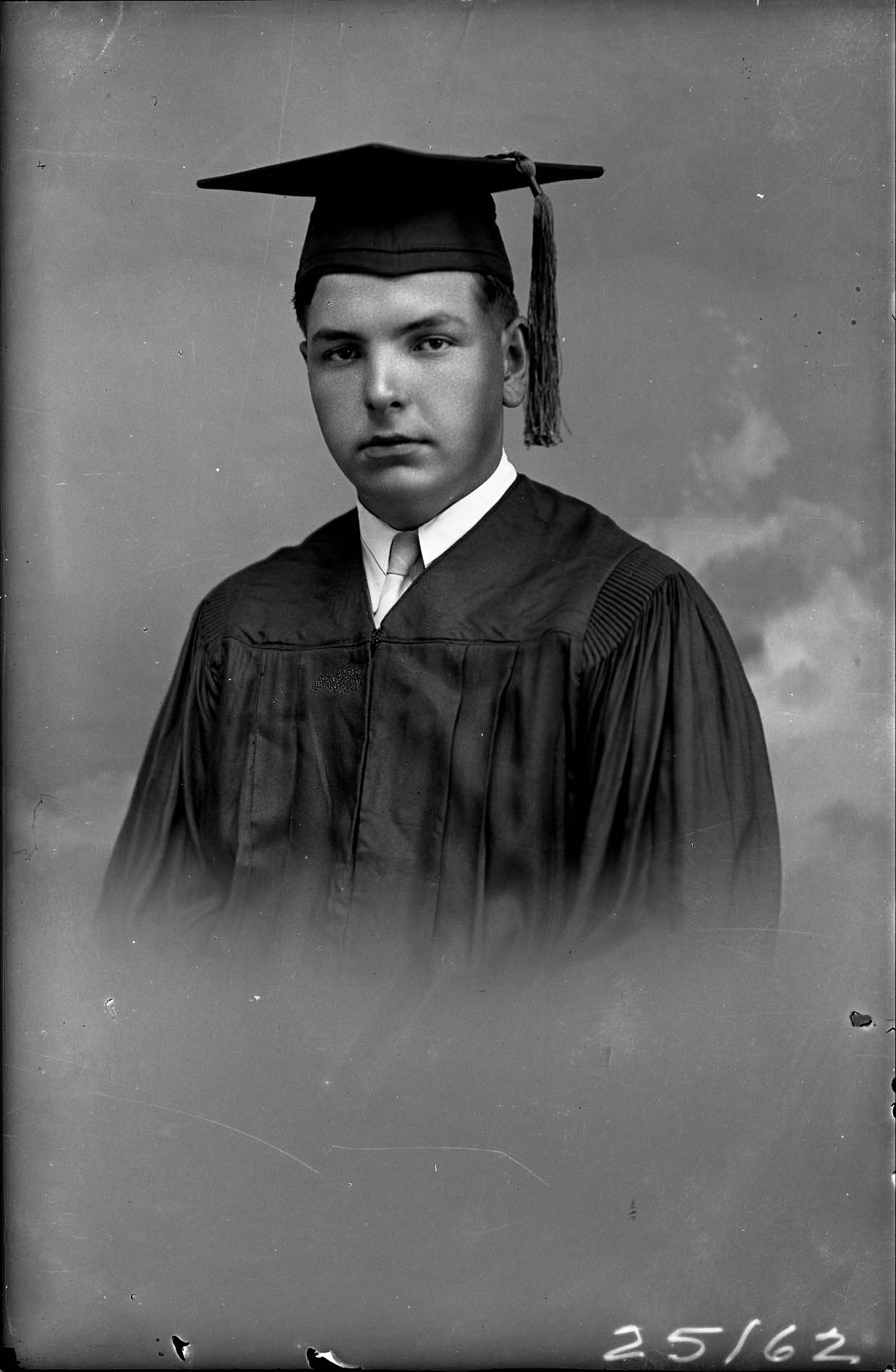 Portrait photograph of an unidentified young man in a graduation cap and gown.