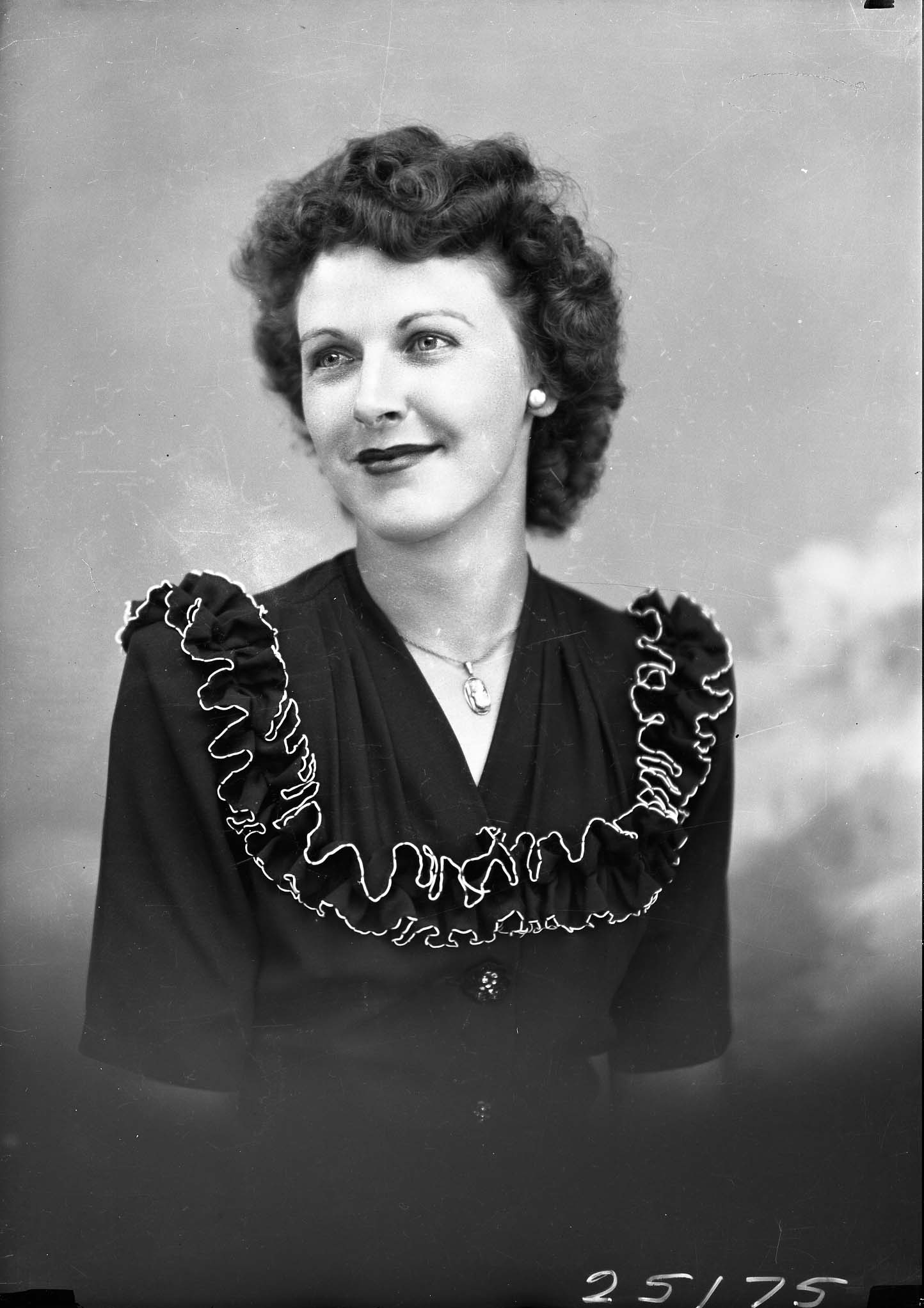 Portrait photograph of an unidentified woman with short, curly hair and wearing a necklace with her dress.