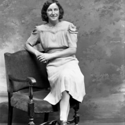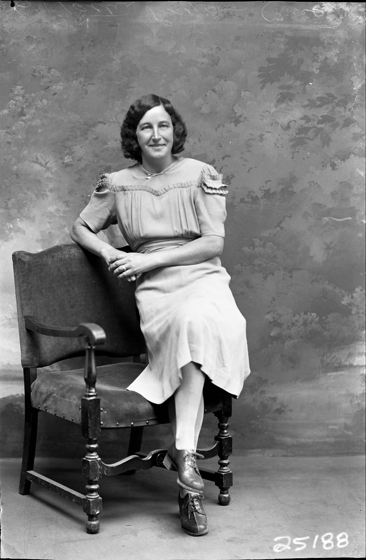 Unidentified young woman is posed on the arm of a chair with one elbow resting on the chair's back.
