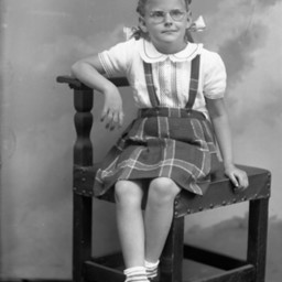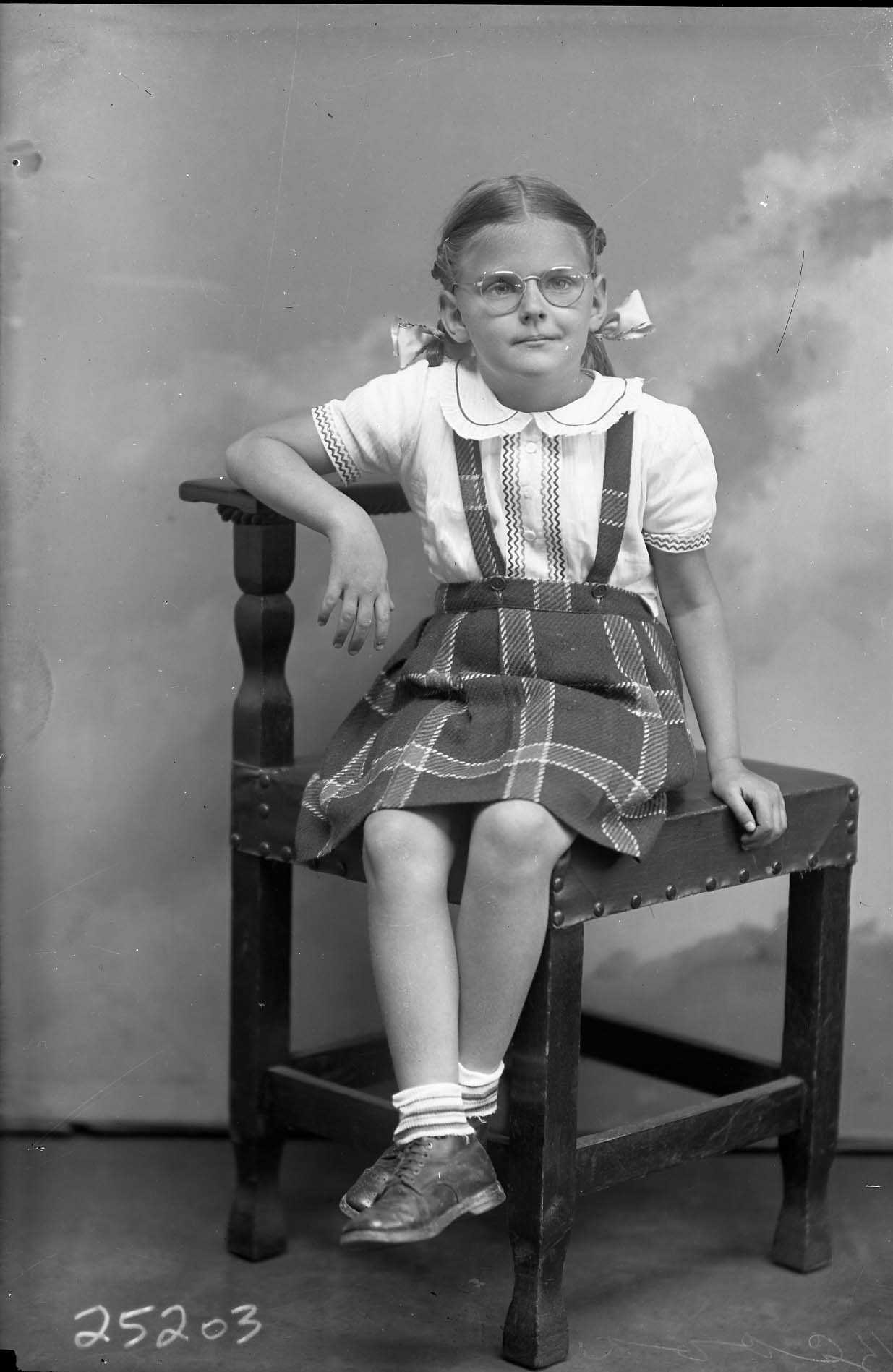 Unidentified girl in glasses and a plaid skirt is seated on a chair.