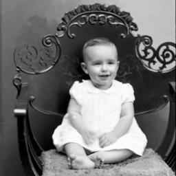 Unidentified barefoot young child is seated on a pillow on a chair.
