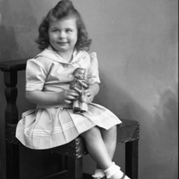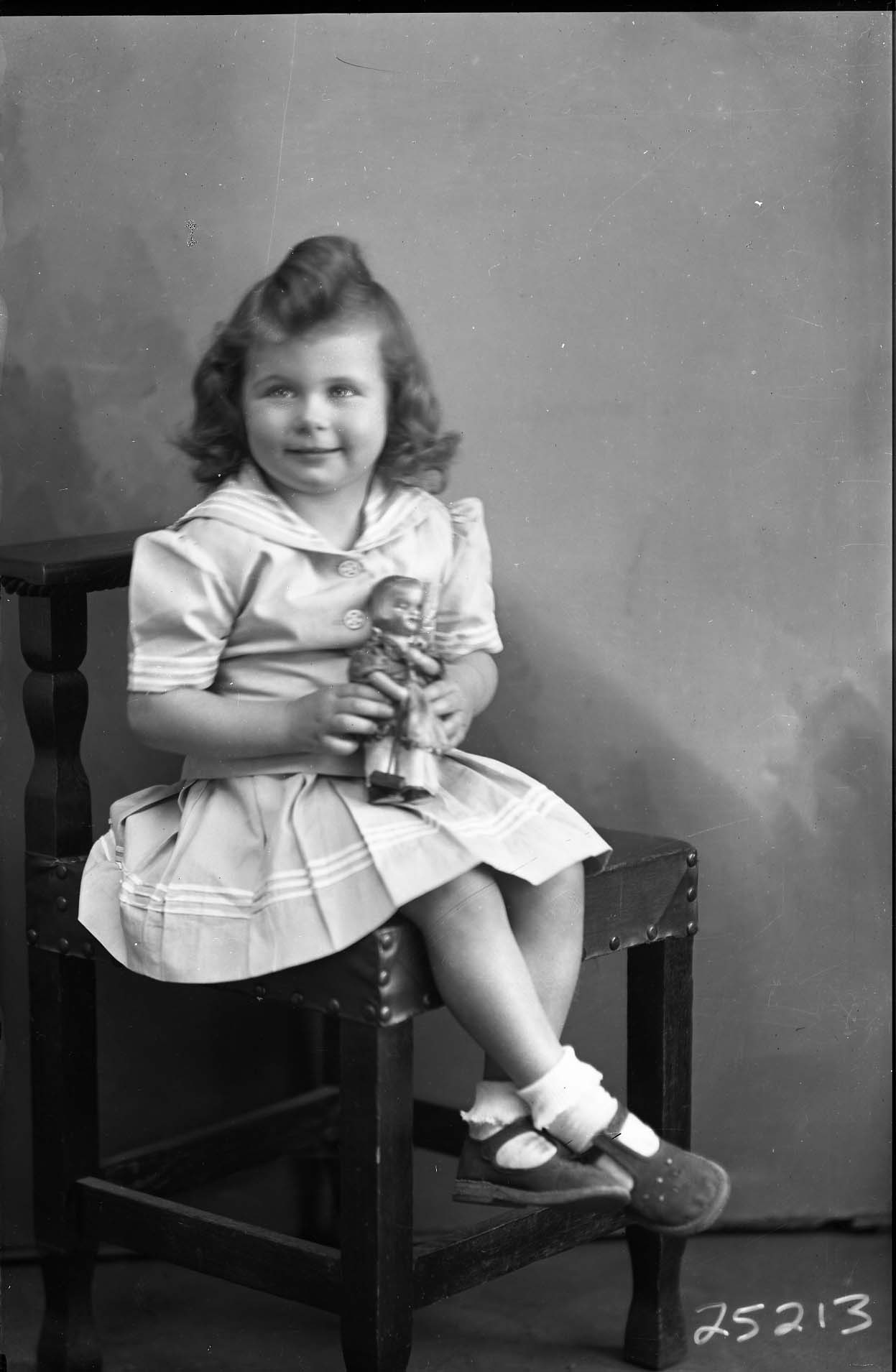 Unidentified girl with curled hair is wearing a sailor-themed outfit, and posed seated on a chair. She is holding a doll.