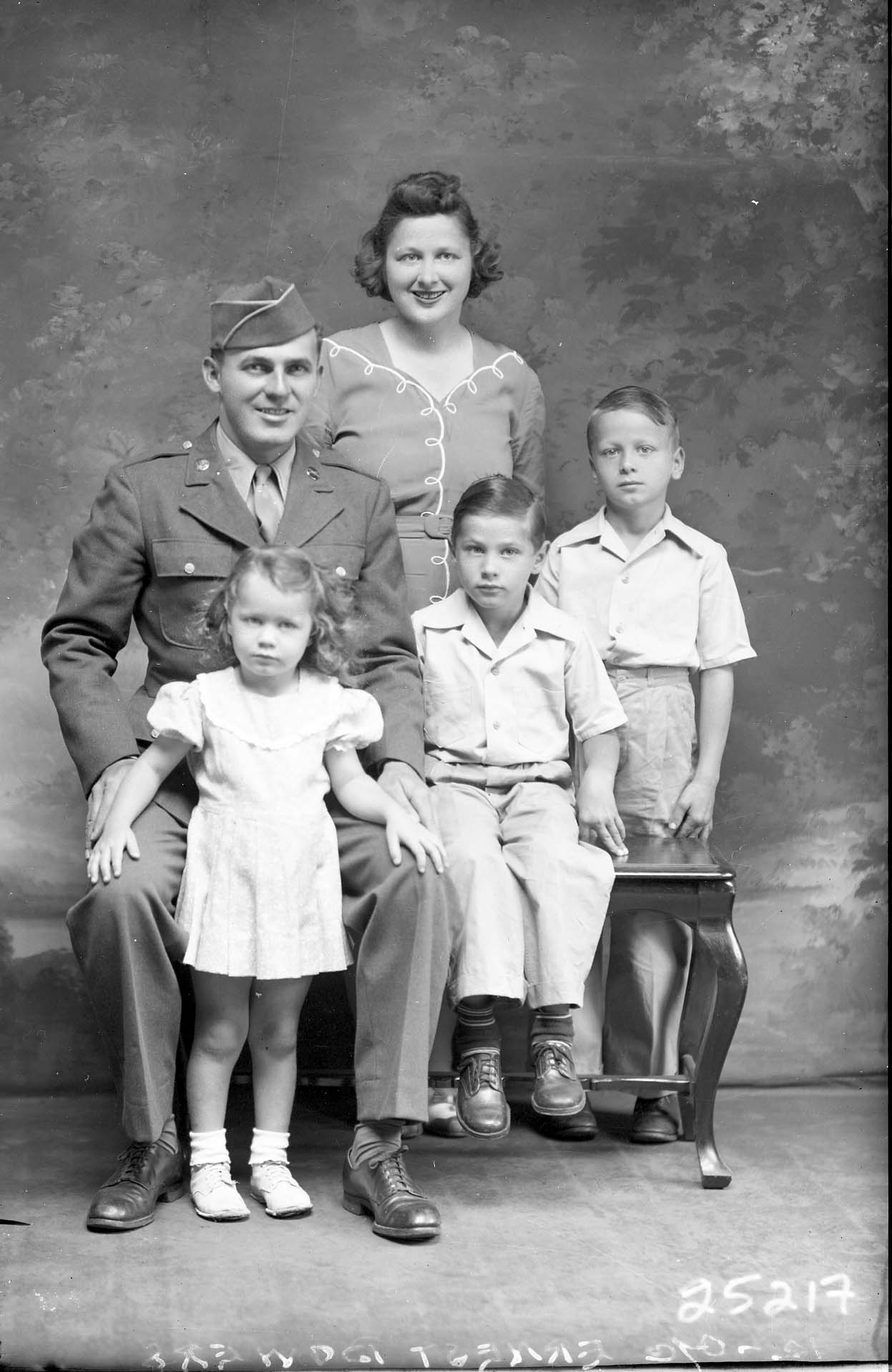 Unidentified man in a U.S. Army uniform is seated with and unidentified woman standing behind him and three unidentified children of varying ages posed around him.