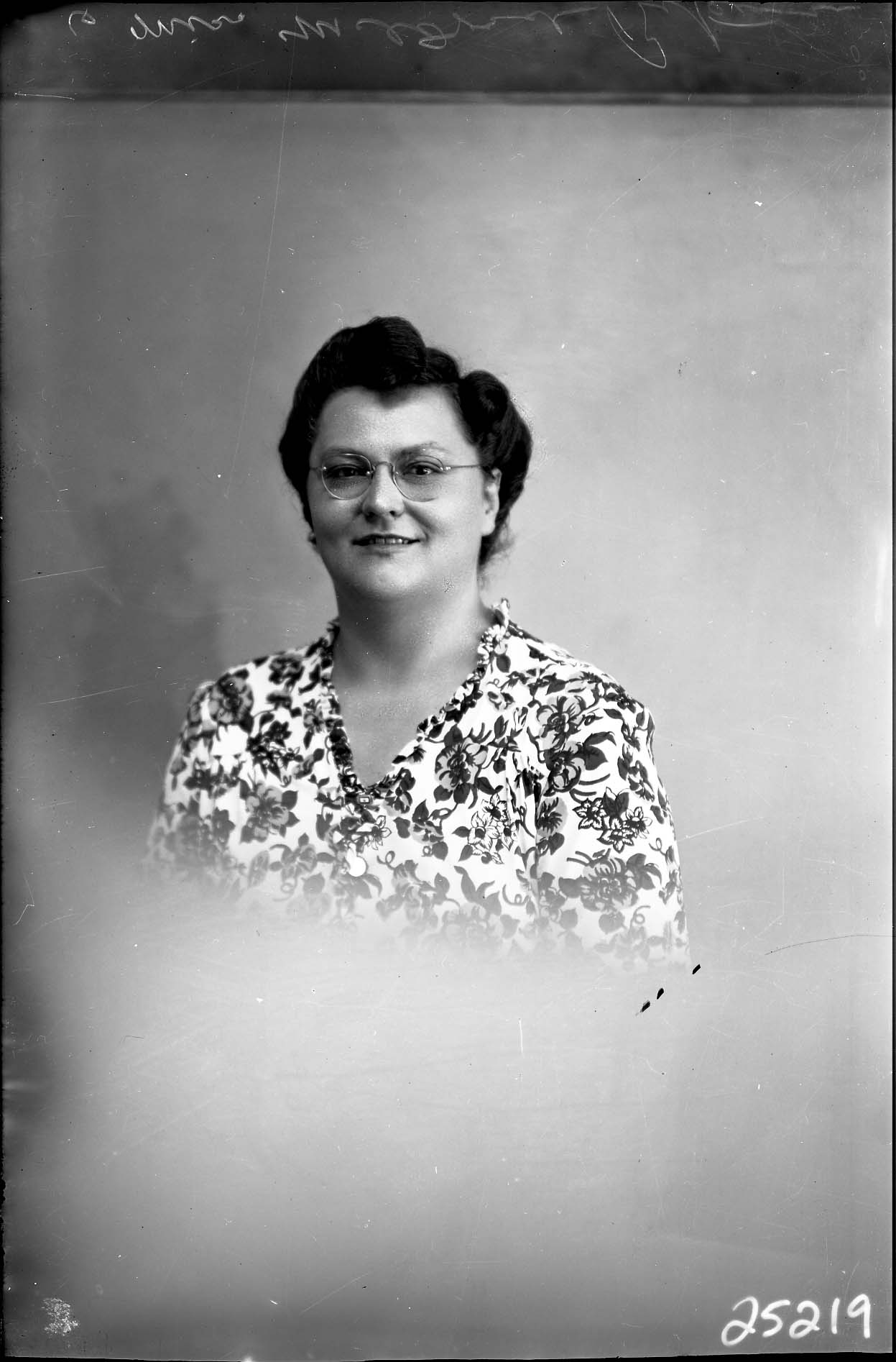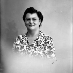 Portrait photograph of an unidentified woman with glasses and wearing a print dress.