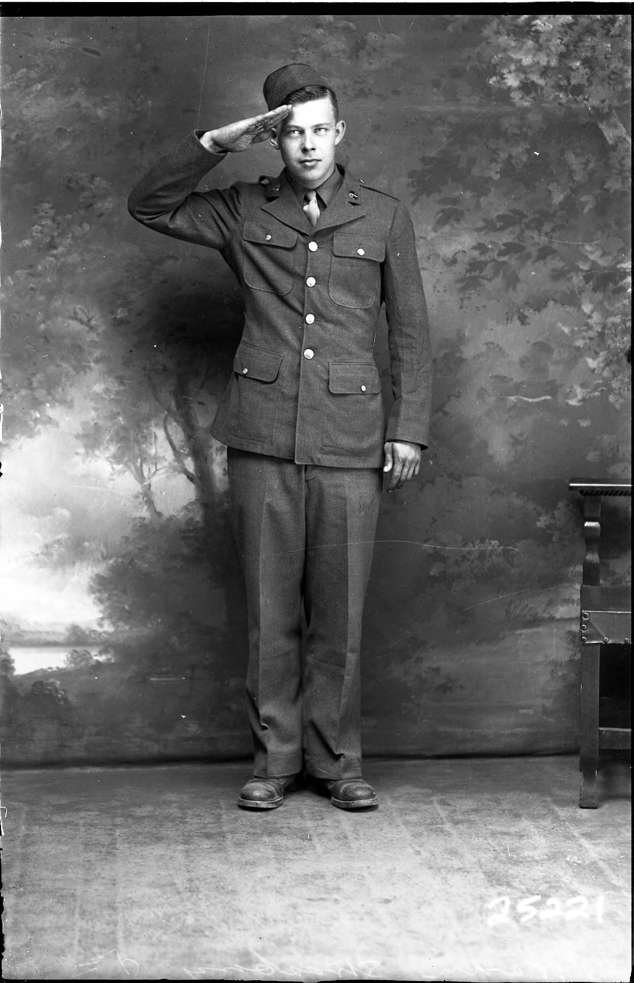 Unidentified man in a U.S. Army uniform is standing and saluting.