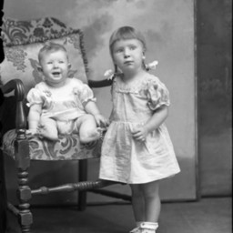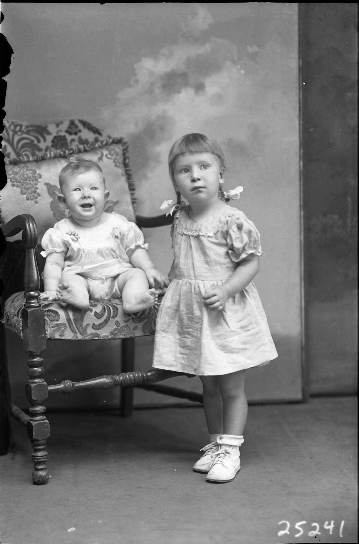 Two unidentified young children, a barefoot baby and an older girl in pigtails, are posed together with a chair.