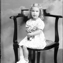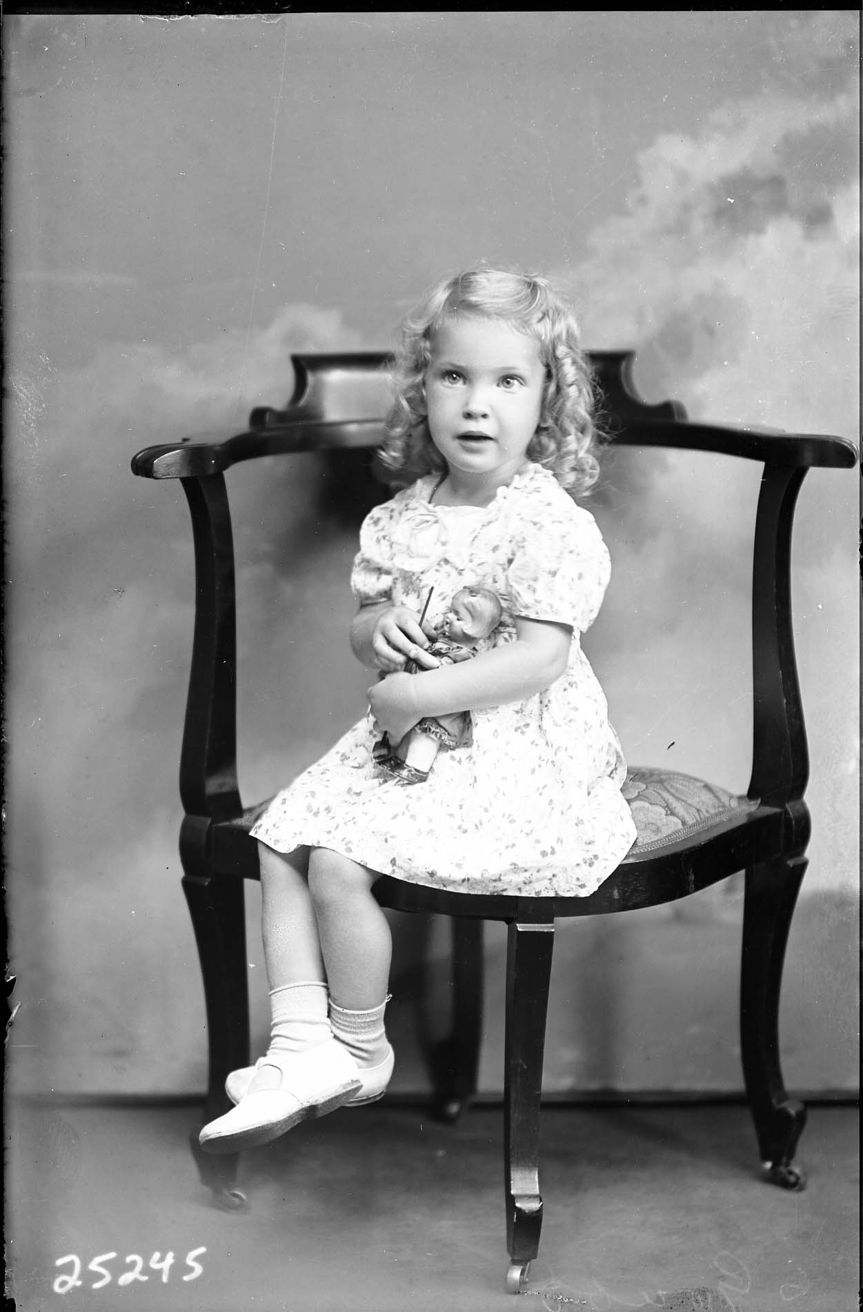 Unidentified young girl with blond curled hair is seated on a chair and holding a doll.