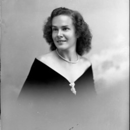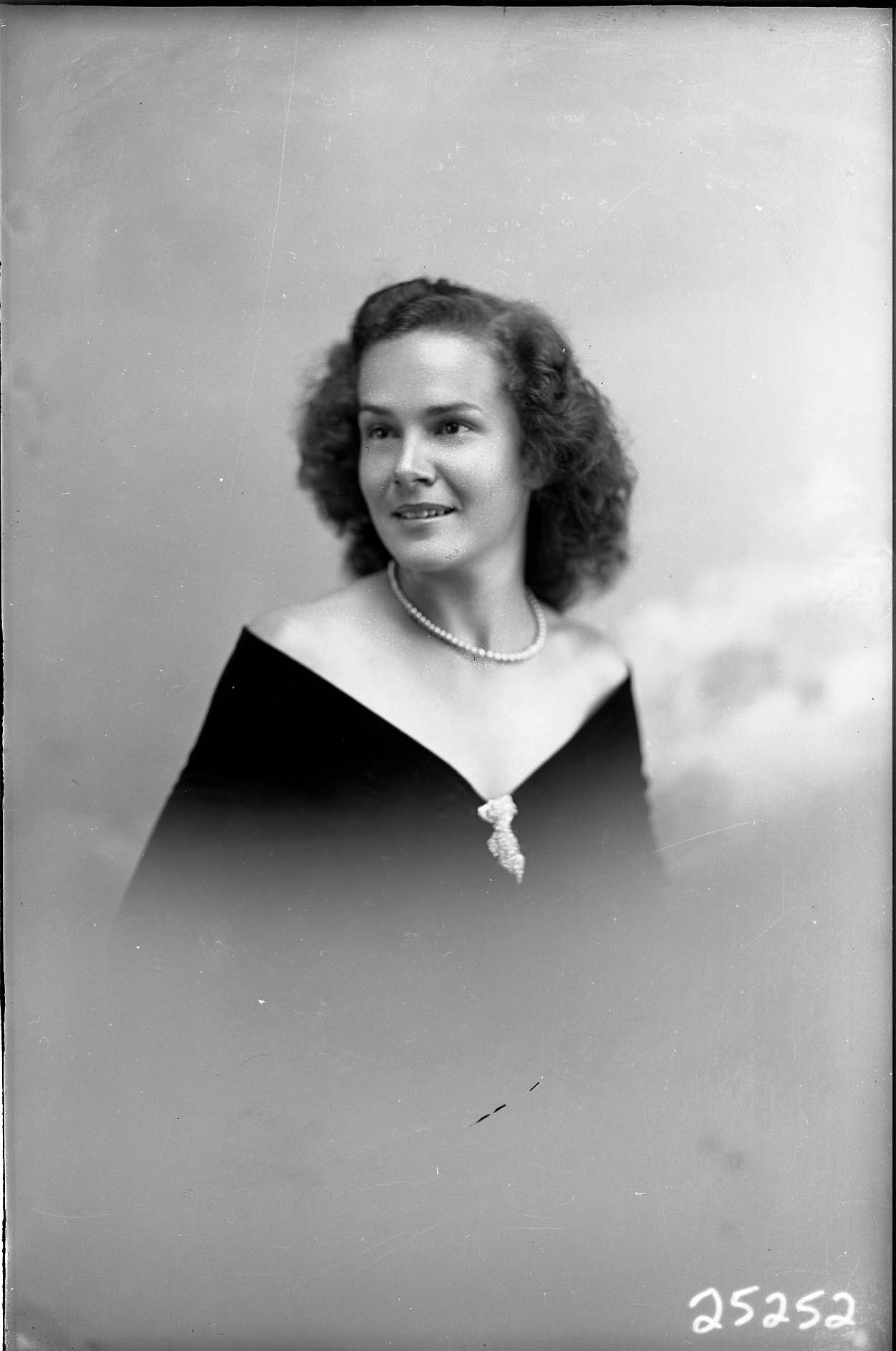 Portrait photograph of an unidentified young woman with shoulder-length hair and wearing a necklace and V-necked dress.