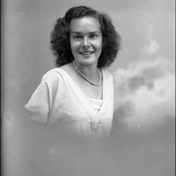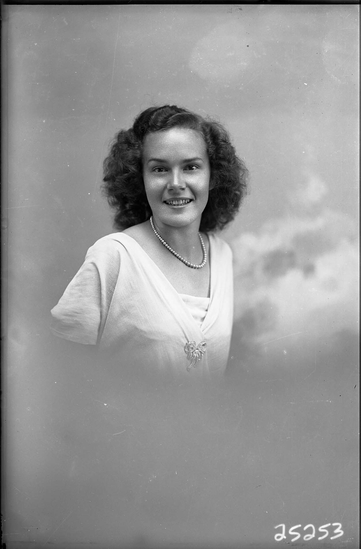 Portrait photograph of an unidentified young woman with shoulder-length hair and wearing faux pearls with her dress.
