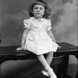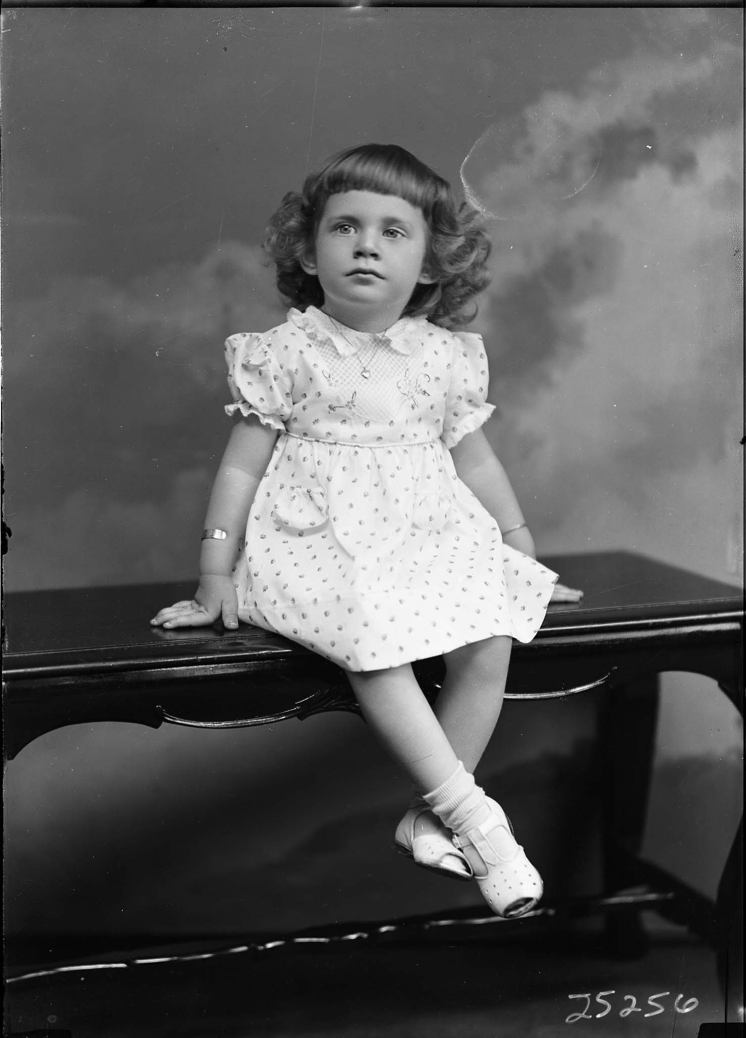 Unidentified young girl with curly hair and bangs is seated on a bench with her ankles crossed.