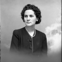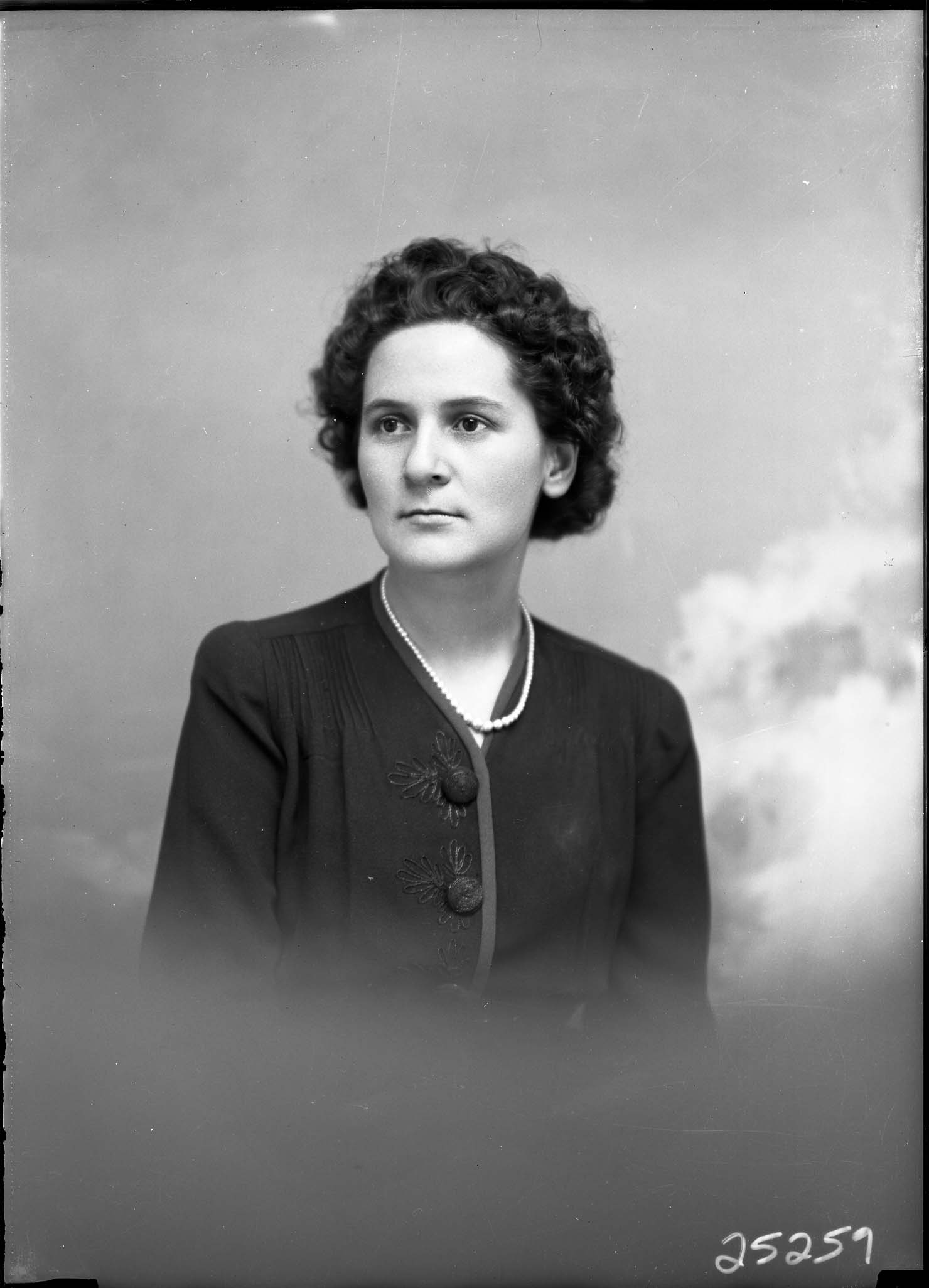 Portrait photograph of an unidentified woman with short curly hair and wearing faux pearls.