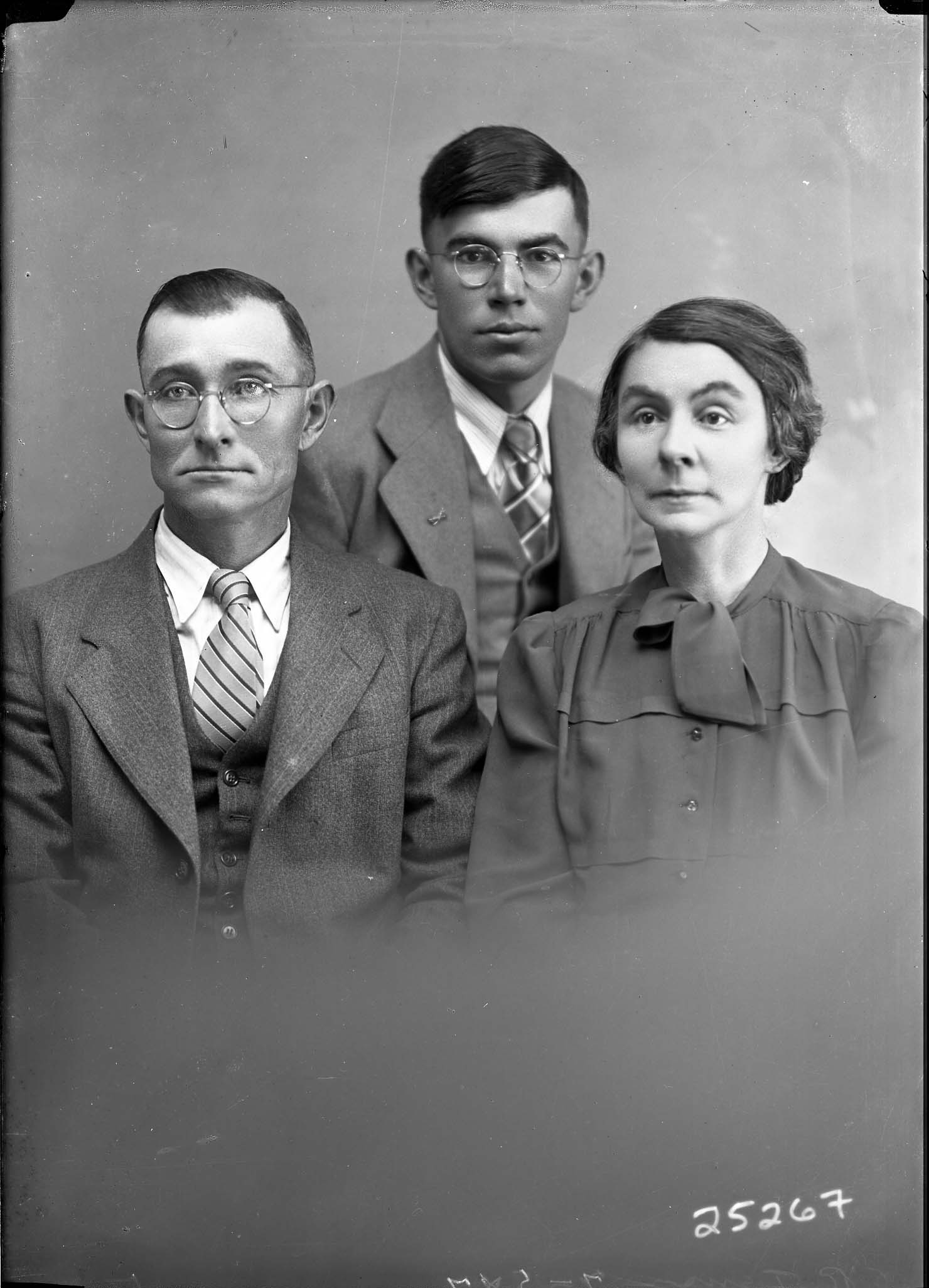 Photograph of Romanus Pence (left) seated beside his wife, Beulah May (Myers) Pence with their son, Lester A. Pence posed behind them.