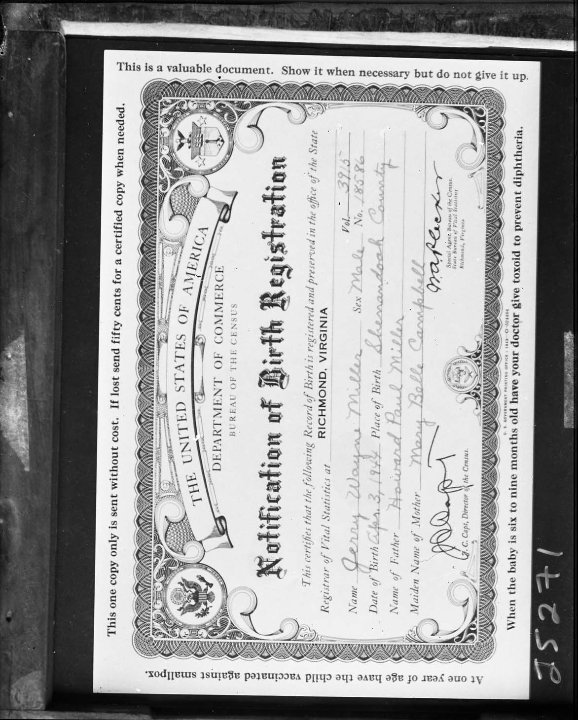Photograph of the birth certificate issued for Jerry Wayne Miller who was born in Shenandoah County on April 3, 1944.