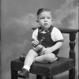 Unidentified young boy is seated on a chair and holding a toy in his lap.