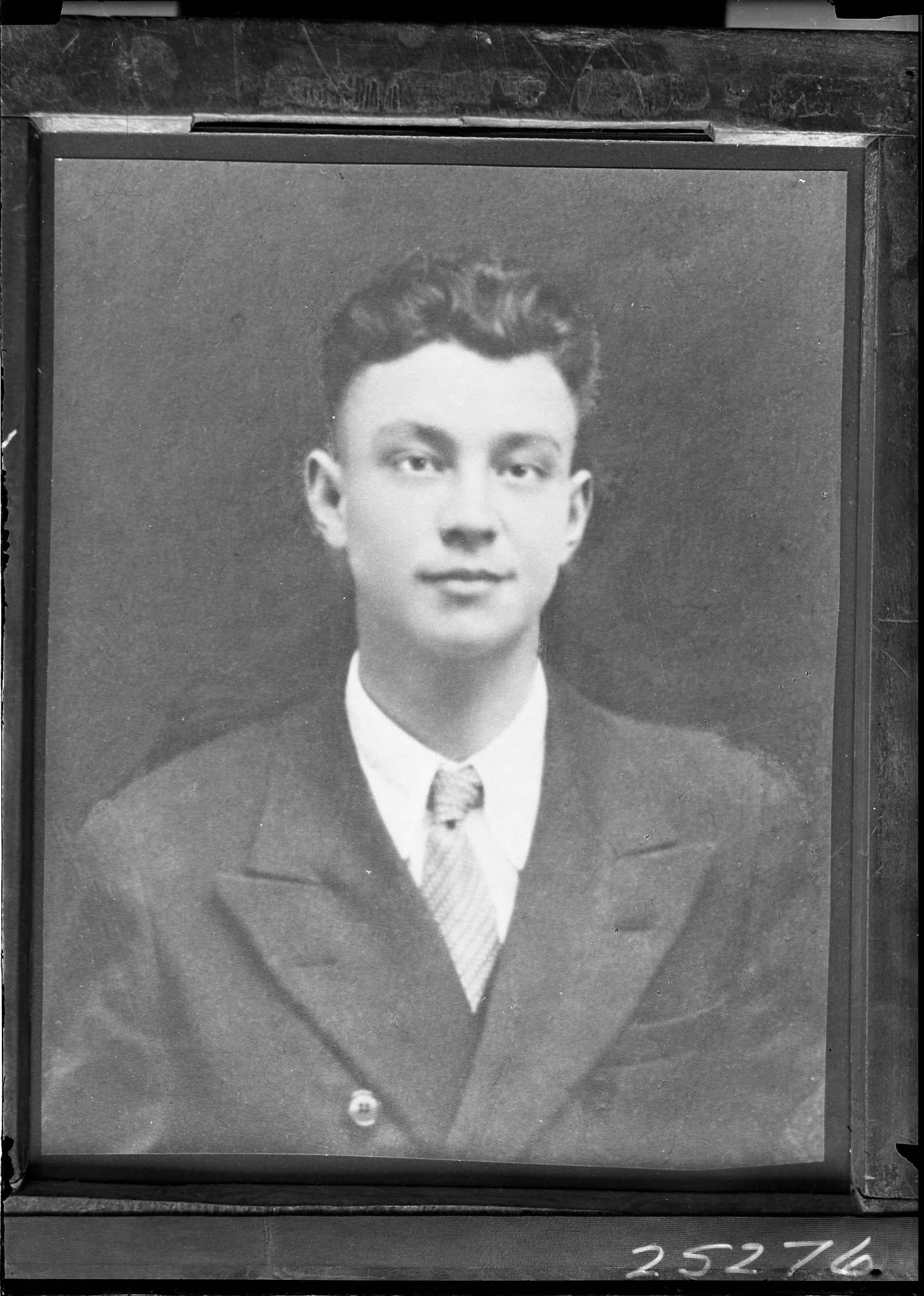Photo of a framed portrait photograph of an unidentified young man wearing a suit and tie.