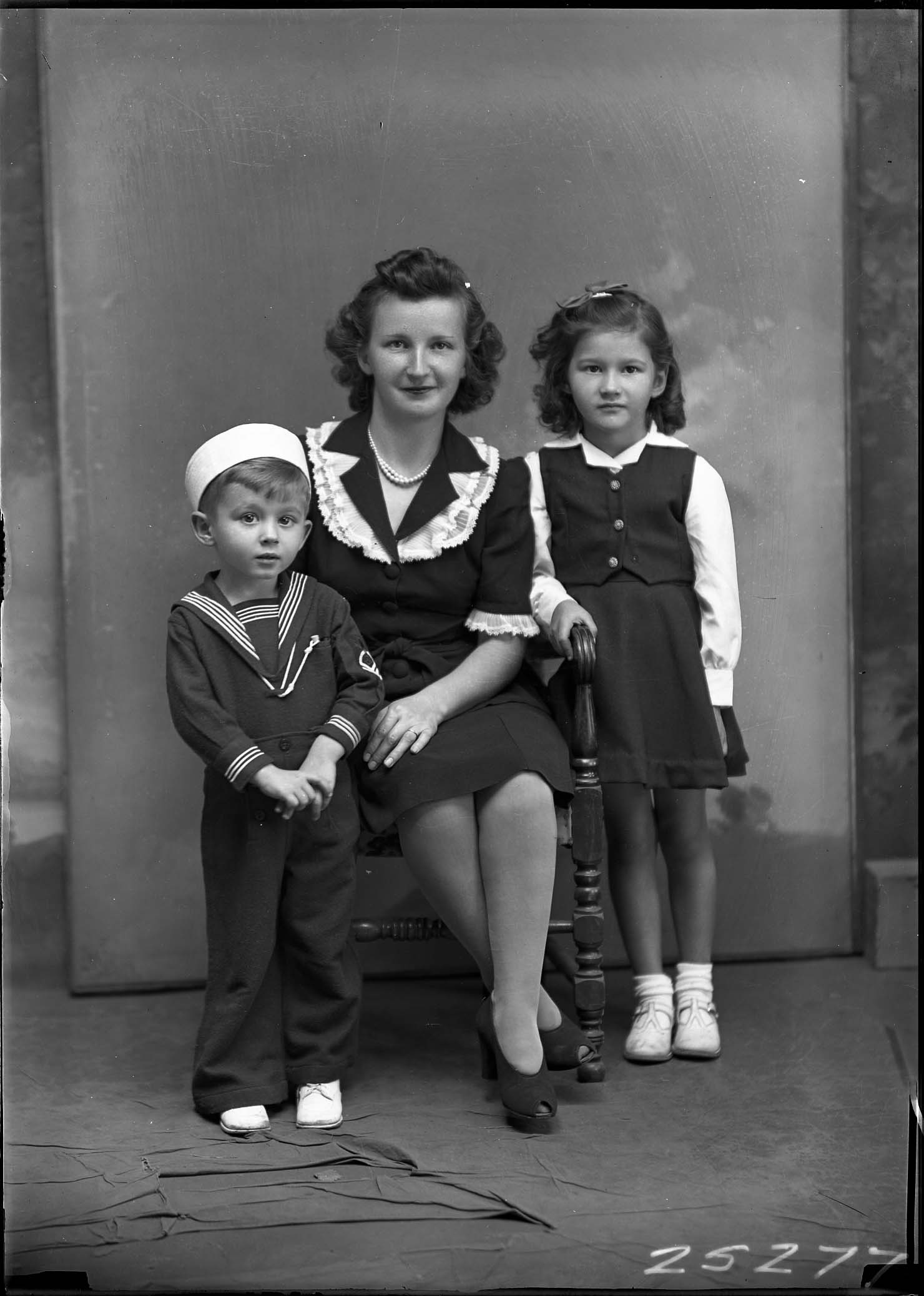 Unidentified woman with short hair is posed between a little boy in a sailor-themed outfit and an older girl.