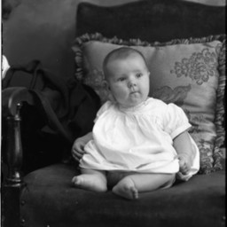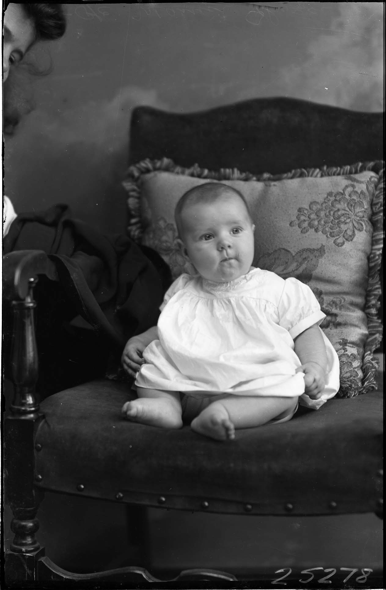 Unidentified barefoot baby is posed against a pillow on a chair.