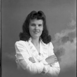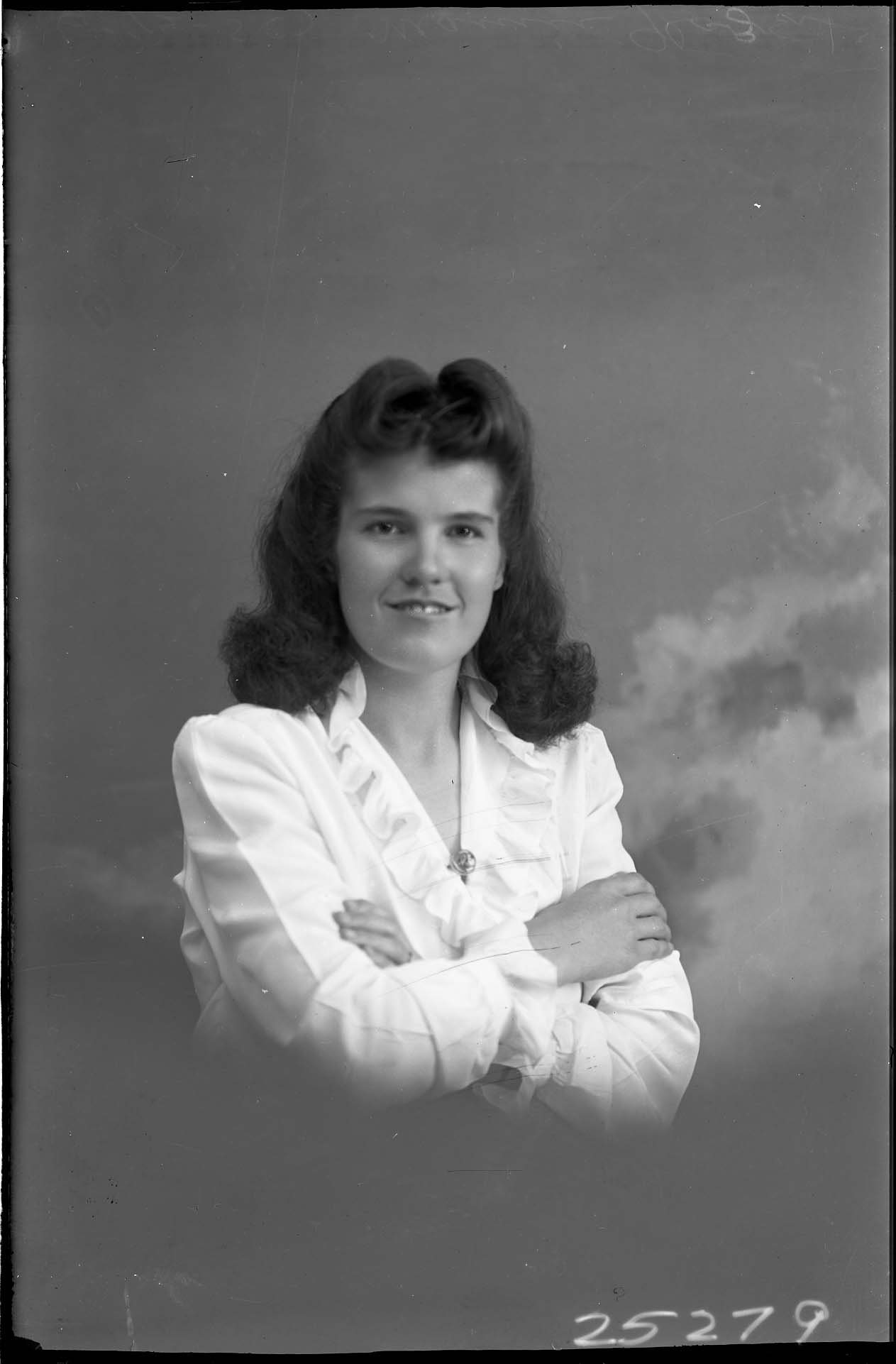 Portrait photograph of an unidentified young woman with dark, shoulder-length hair and posed with her arms crossed in front of her.