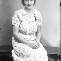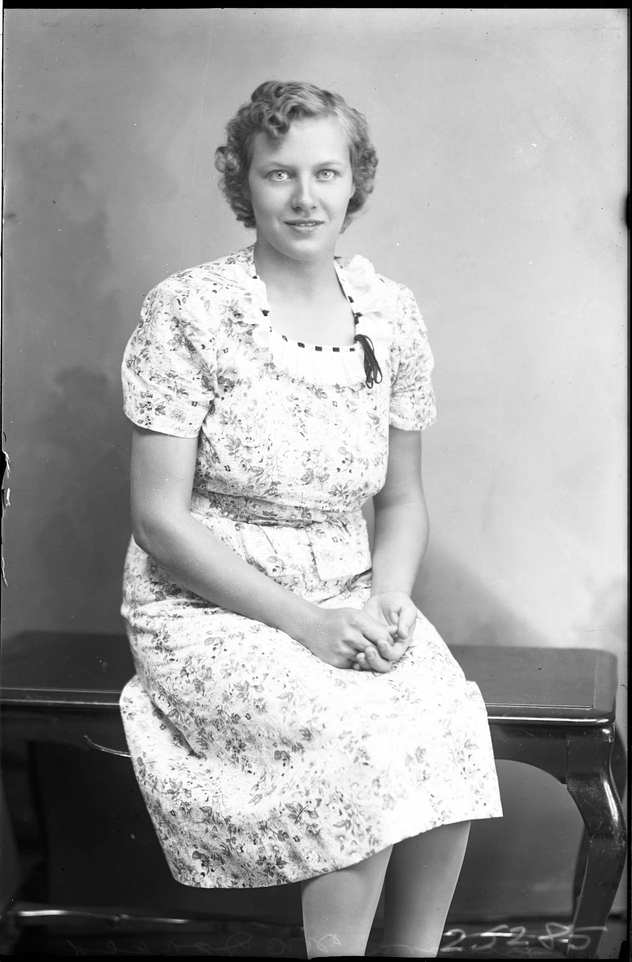 Unidentified woman with short, curly hair and wearing a print dress is seated on a bench.