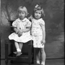 Two unidentified little girls, one seated with short blond hair and the other one standing with a bow in her hair.
