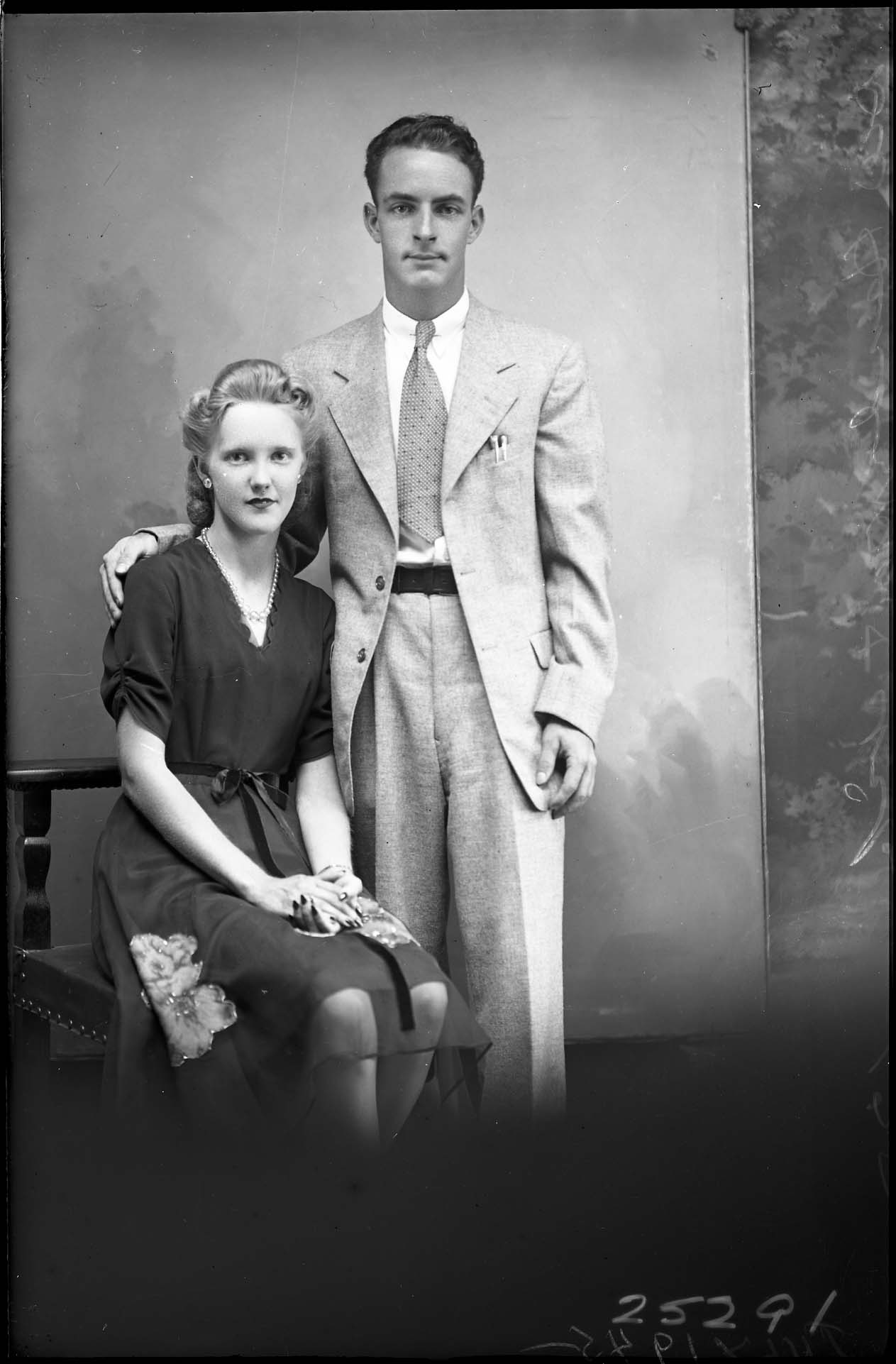 Unidentified young woman, seated, with an unidentified young man standing beside her.