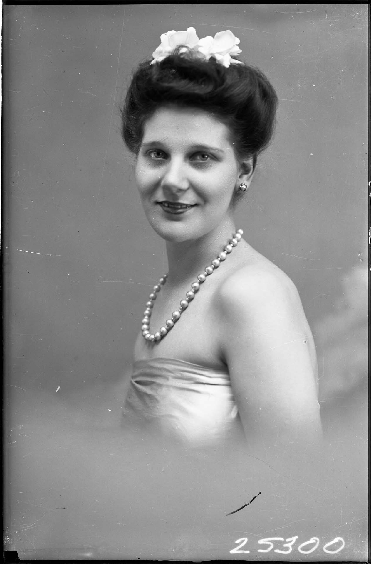 Portrait photograph of a woman wearing flowers in her hair and a necklace with her dress.