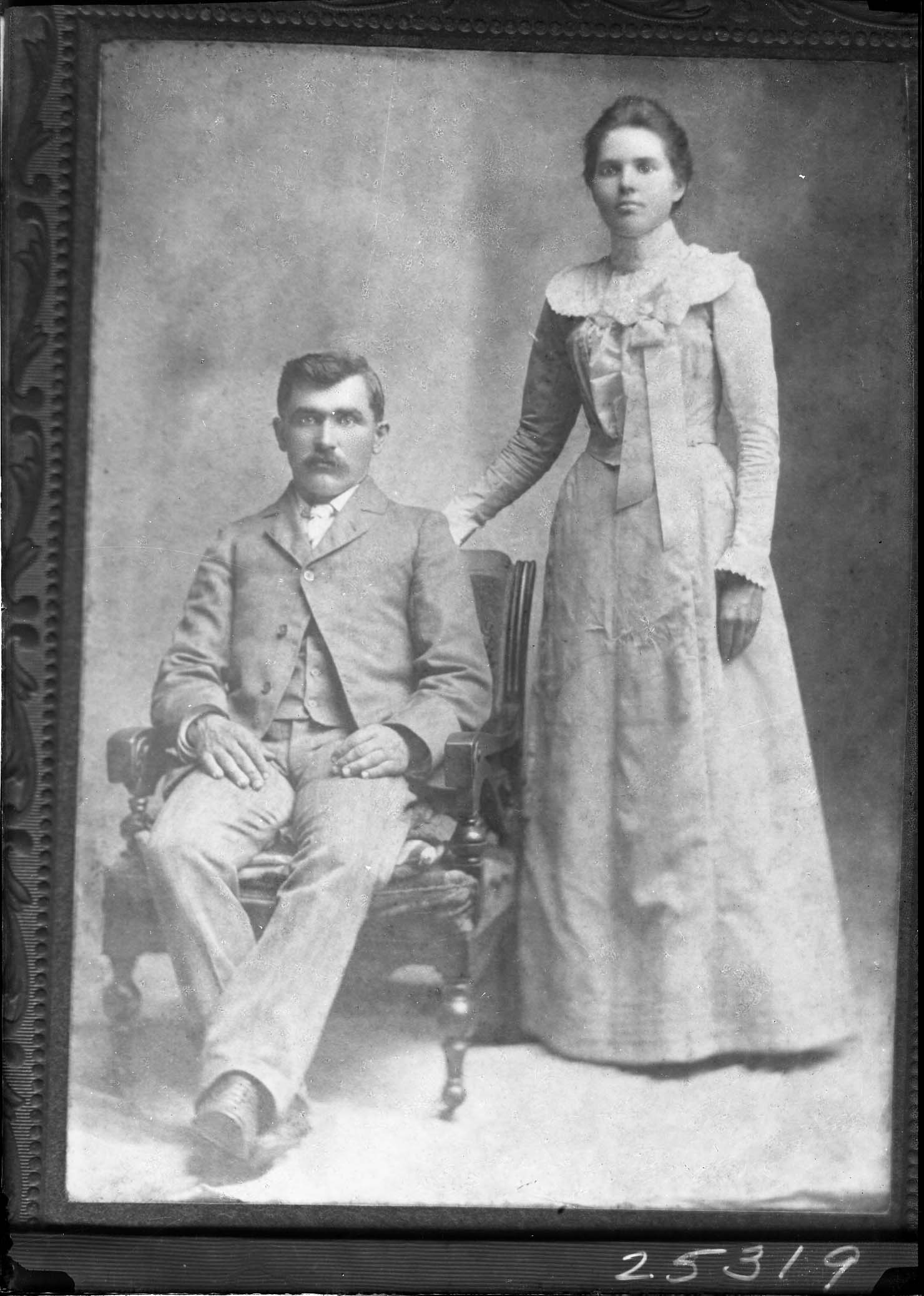 Photo of an older photograph of an unidentified man with a mustache, seated, with an unidentified woman in a long-sleeved, floor-length dress standing beside him.