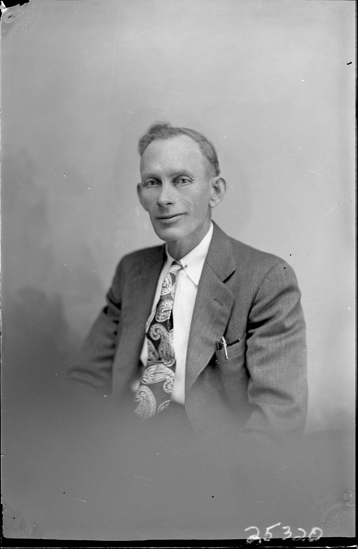 Portrait photograph of an unidentified man wearing a suit and tie with a pen visible in his breast pocket.