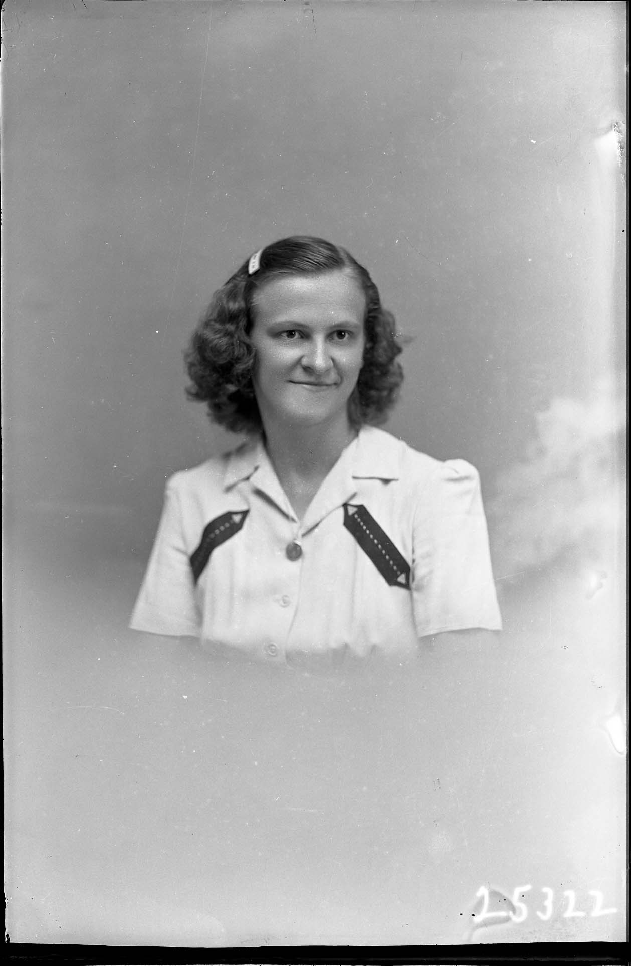 Portrait photograph of Janet (Long) Sine as a young woman with her short hair held with a barrette.
