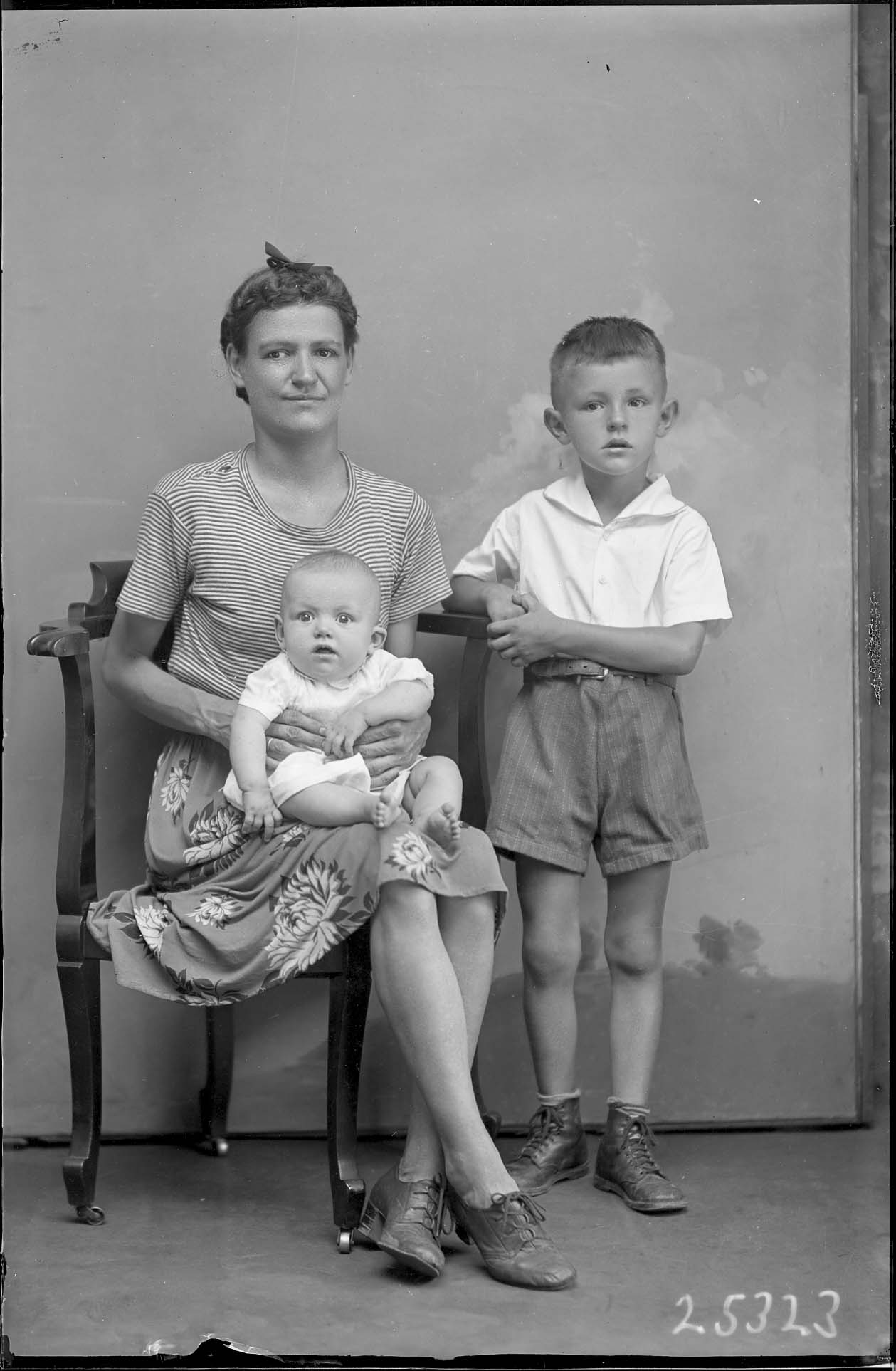 Minnie A. (Teets) Pryor, seated, with her two children, William M. Pryor (standing) and Christina Ann Pryor on her lap.