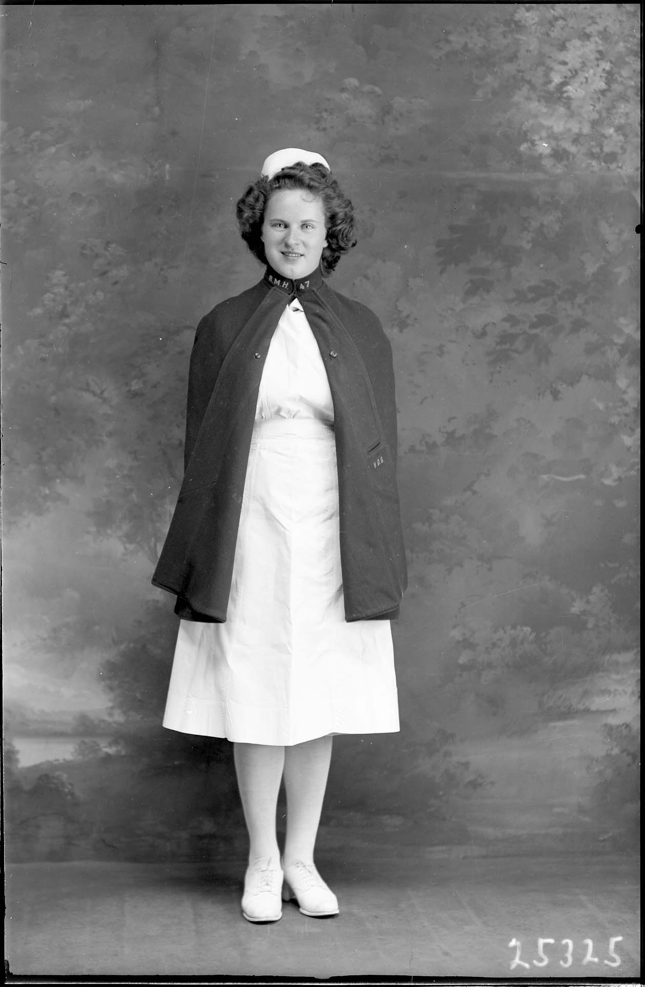 Photograph of Vada D. (Gochenour) Alexander standing in her nurses uniform and wearing a cape with the letters "RMH" and the number, "47" on the collar.