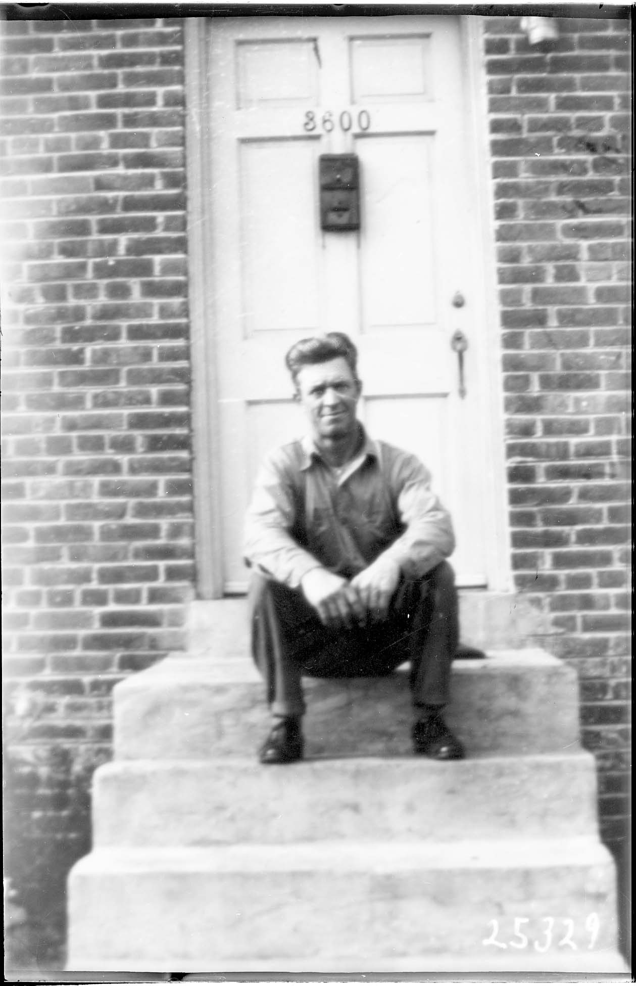 Luther Funkhouser seated on concrete steps in front of a brick house and door. The address is "8600".