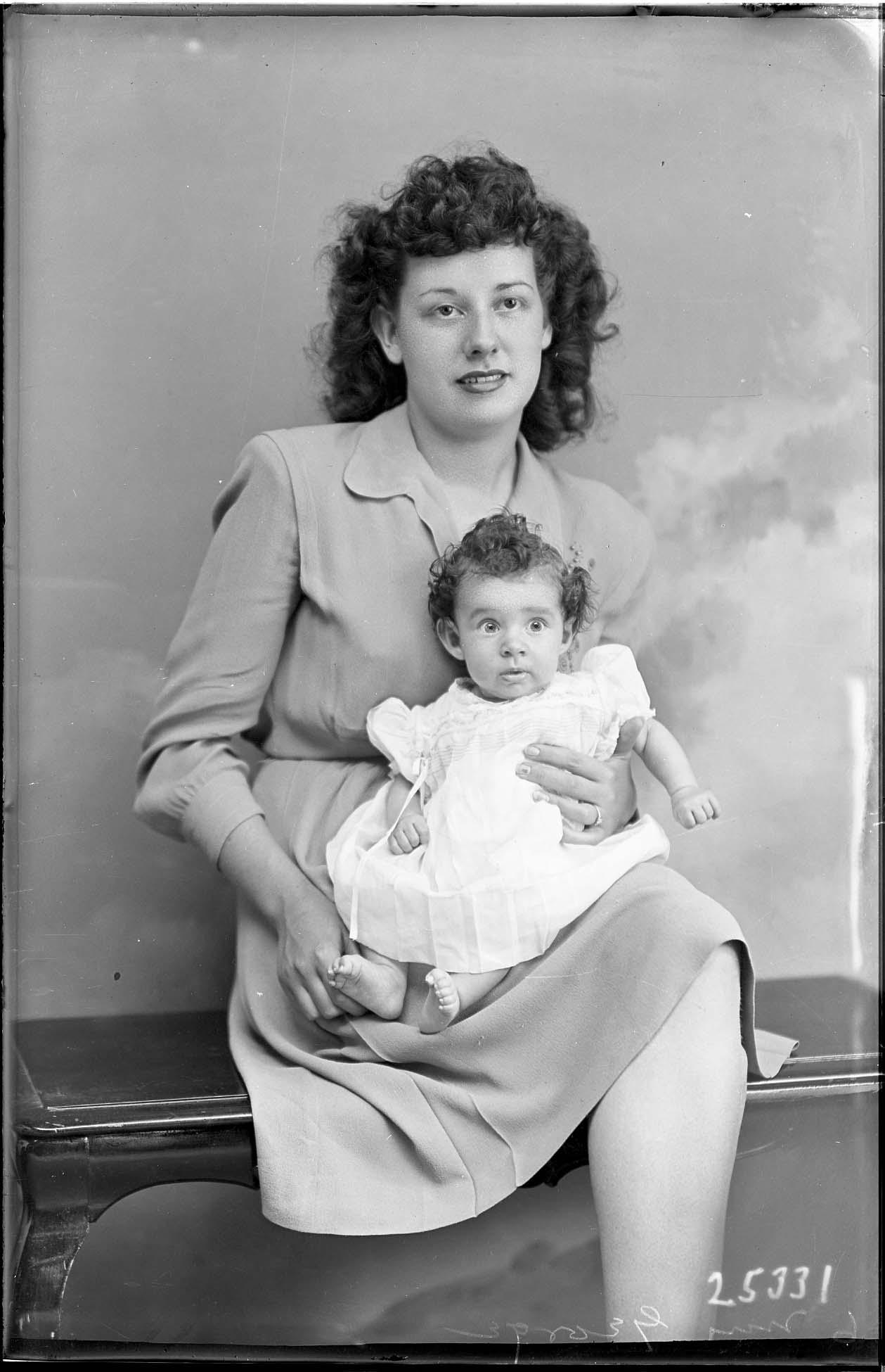 Unidentified woman with shoulder-length, curly hair is seated on a bench, and holding an unidentified young child on her lap.