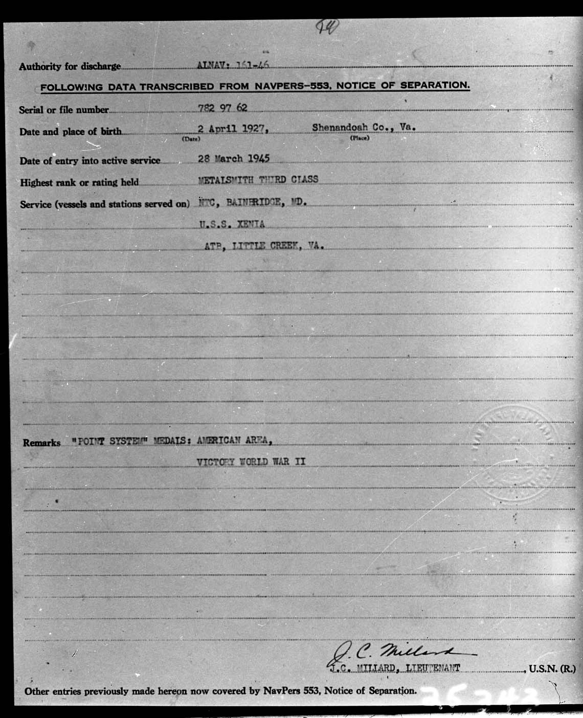Morrison Studio, “Page From a Naval Separation Packet,” Shenandoah County Library Archives, accessed December 6, 2025, https://archives.countylib.org/items/show/55005.