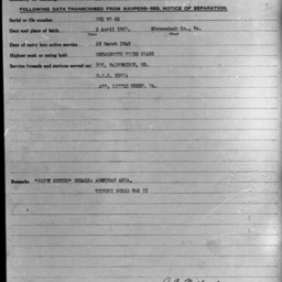 Photograph of a single page from a Notice of Separation packet for an unnamed Metalsmith Third Class who was born in Shenandoah County, Virginia, on 2 April 1927.