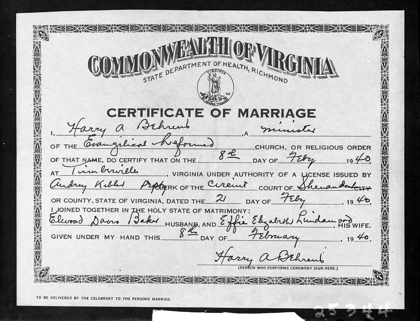 Photograph of the marriage certificate issued for the marriage between Elwood Davis Baker and Effie Elizabeth Lindamood that took place in Timberville on February 8, 1940.