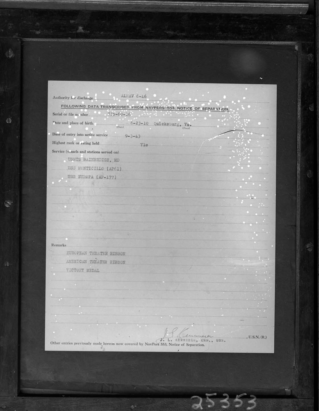 The name, J.L. Kemmerer, Ensign, appears at the bottom of the page, and may be the person who prepared the form.