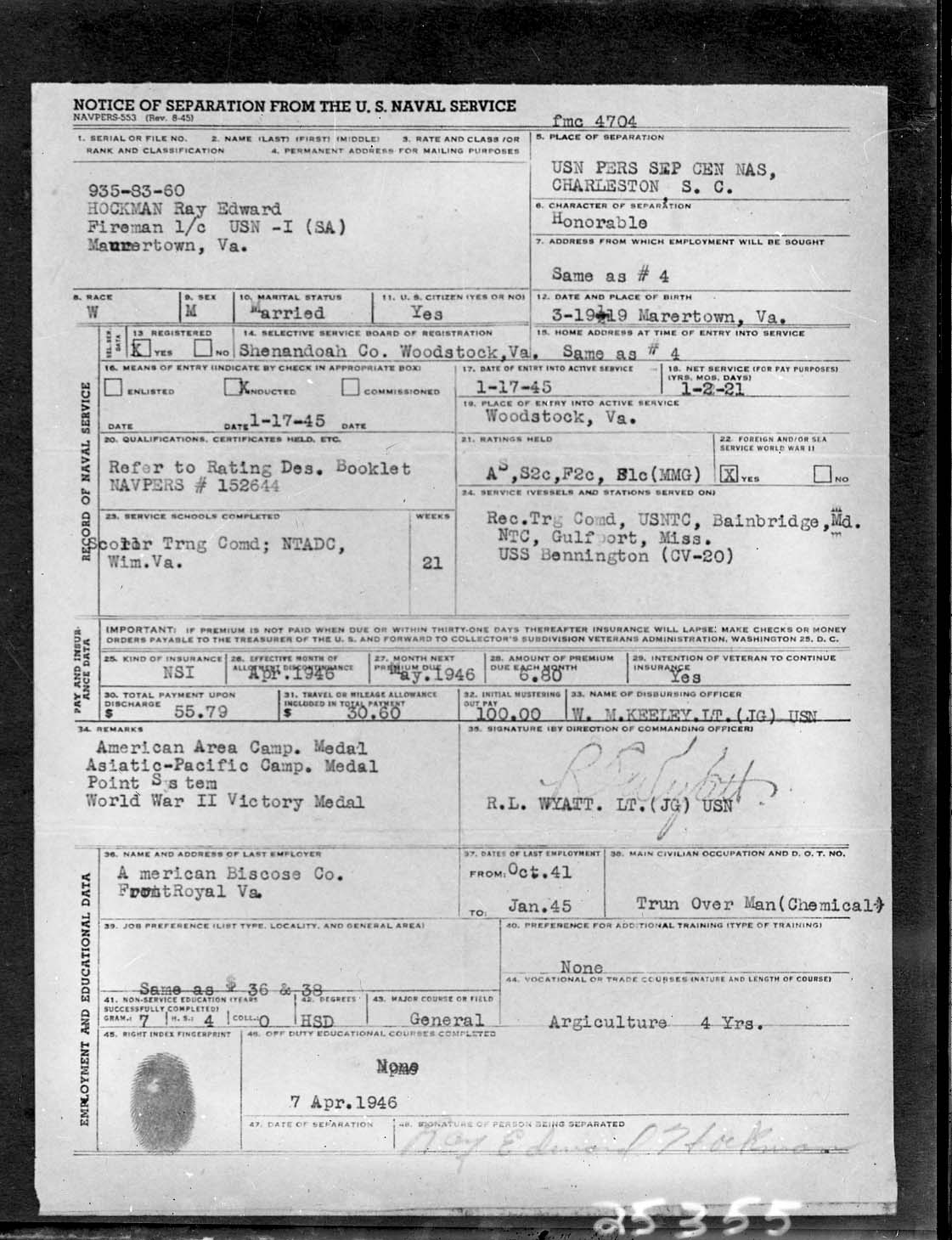 Morrison Studio, “Ray Edward Hockman Separation From the Navy,” Shenandoah County Library Archives, accessed December 5, 2025, https://archives.countylib.org/items/show/55018.