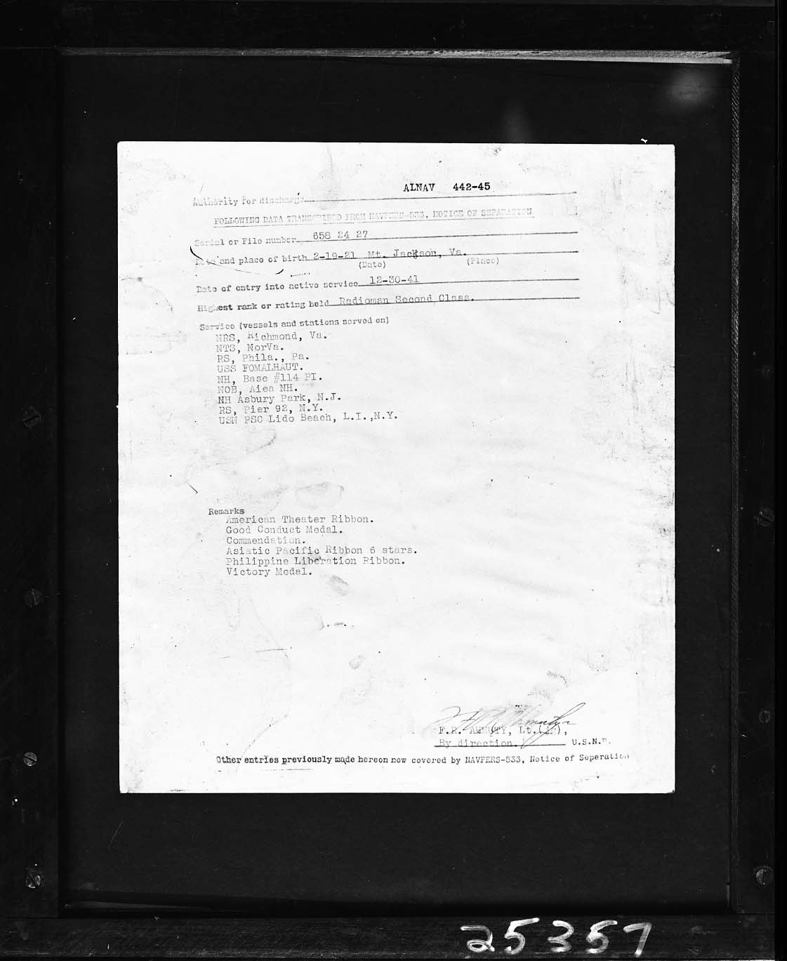 He entered Naval service on 30 December 1941. He served in several duty stations both in the U.S. and overseas.