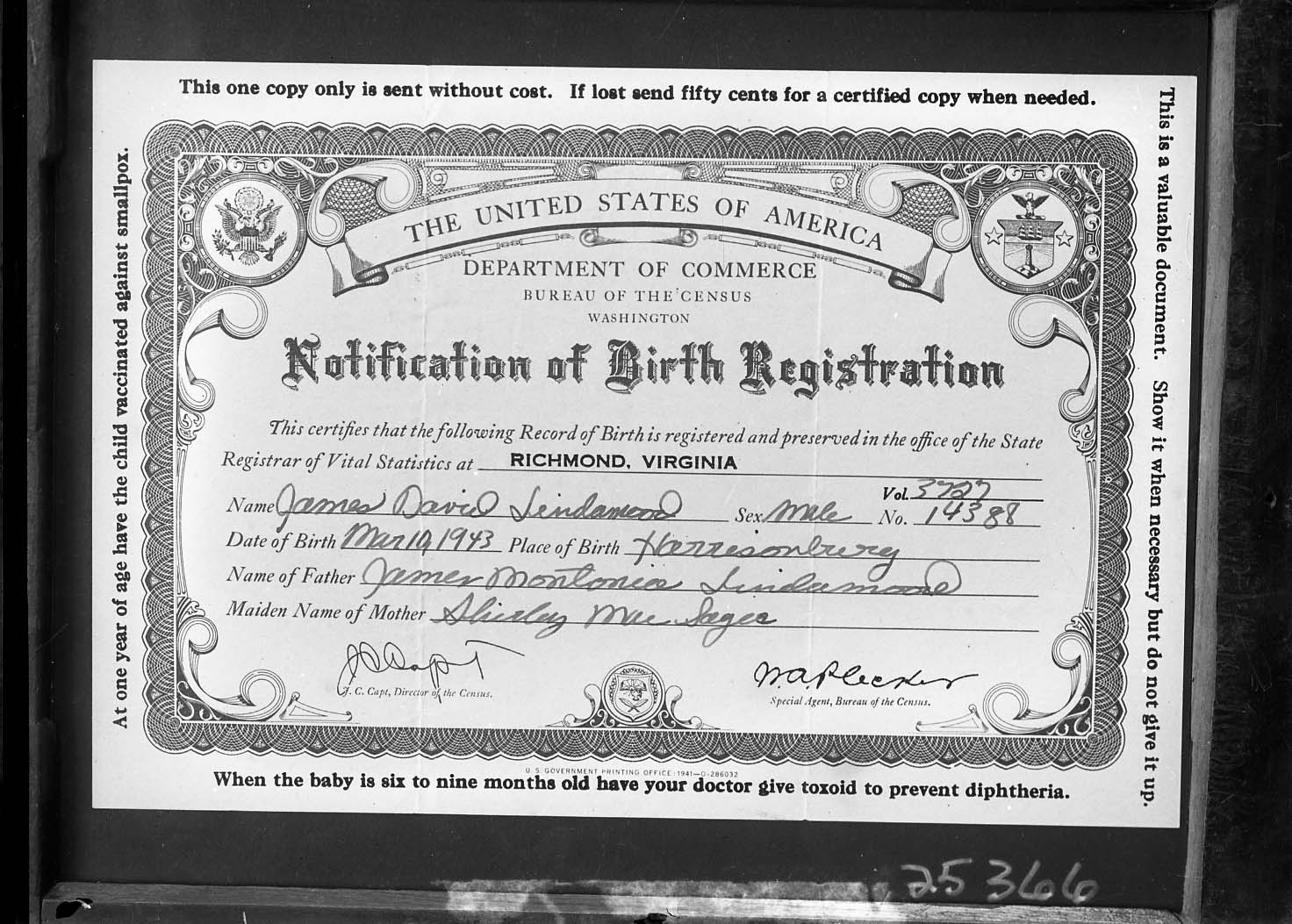 Photograph of the birth certificate issued for James David Lindamood who was born on March 19, 1943, in Harrisonburg, Virginia.