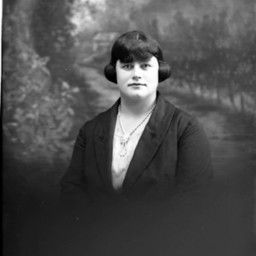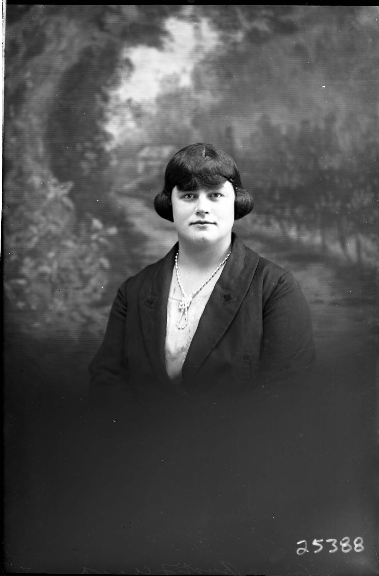 Portrait photograph of an unidentified woman with short hair and bangs. She is wearing a necklace with her outfit.