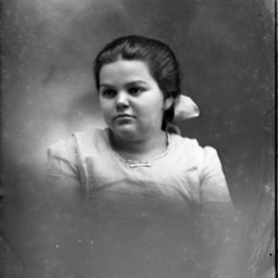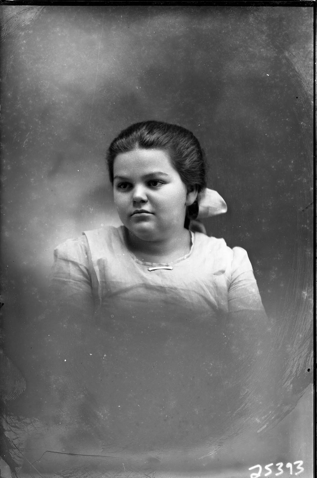 Portrait photograph of an unidentified young woman with her hair pulled back and looking slightly to the side of the camera.