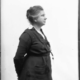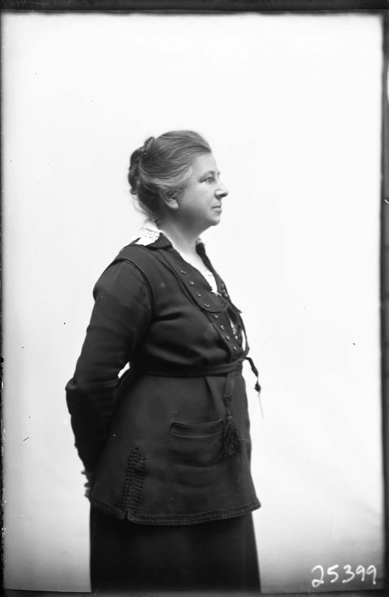 Unidentified woman with her hair pulled up, is standing in profile with her hands behind her back.