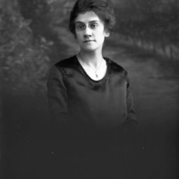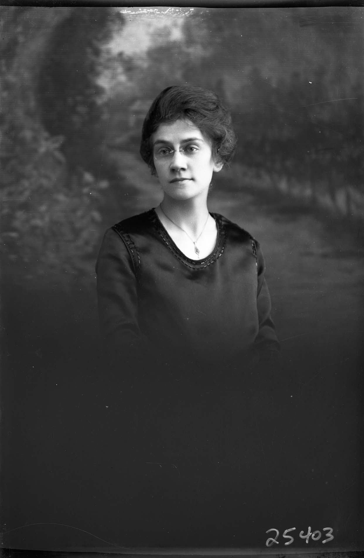 Portrait photograph of an unidentified woman with her hair pulled back and wearing glasses.