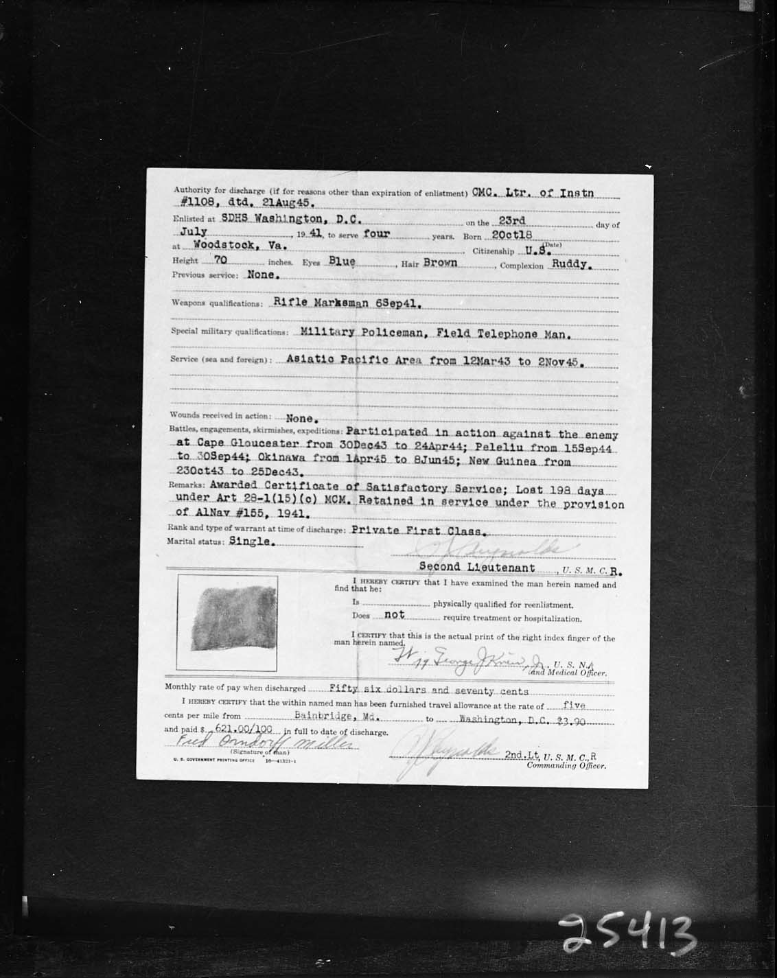 Photograph of a form pertaining to Fred Orndorff Miller's discharge from the U.S. Marine Corps in August 1945.